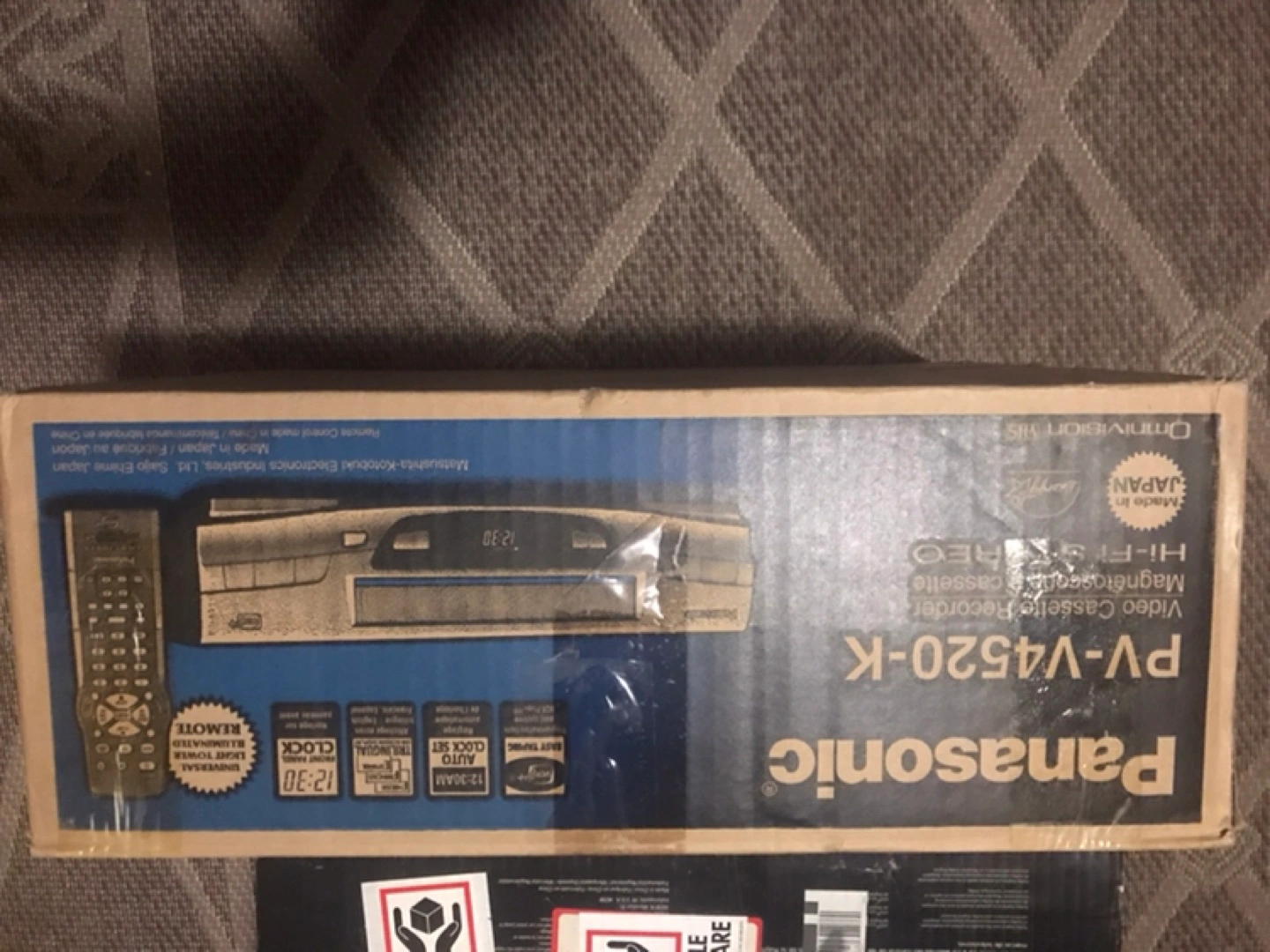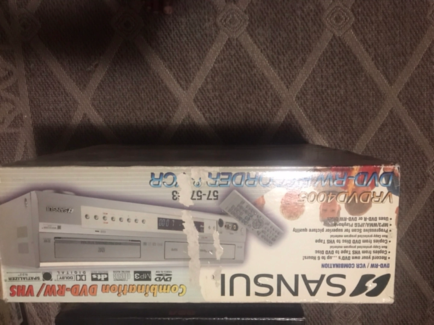 50Three players: Panasonic VHS recorder in box, Sansui DVD/VHS combo player in box, and RCA DVD player in box. All new/unused, but boxes show some wear.