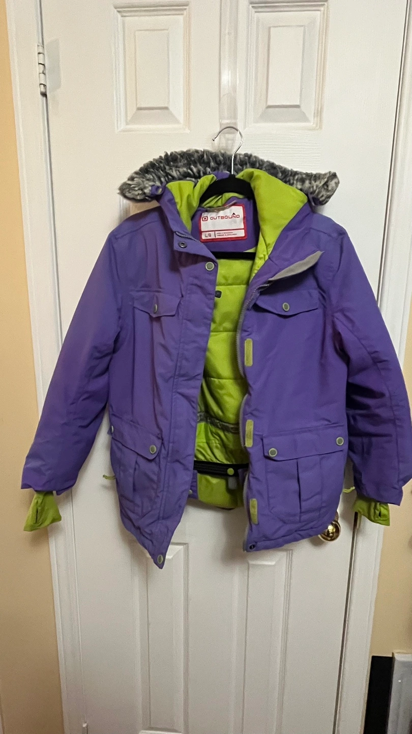 Large Outbound jacket$10 & free boots! Purpule exterior, lime green interior. Features a faux fur-lined hood and multiple pockets. Warm and waterproof. Washed ready to use!
