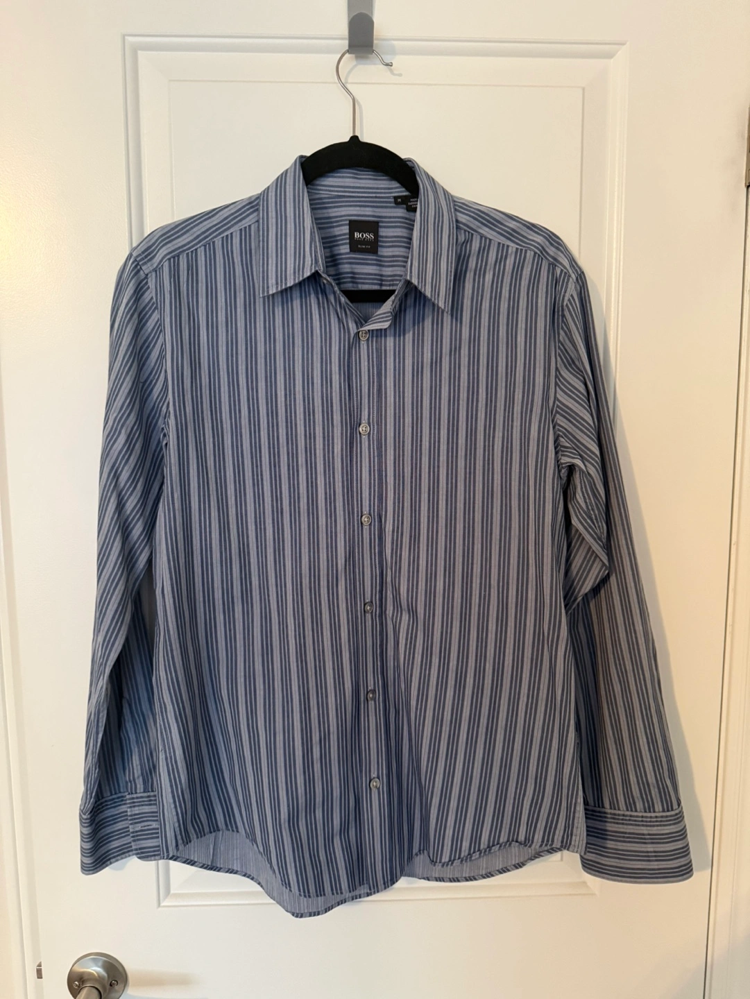 Men's Hugo Boss dress shirt. Slim fit. Blue and white vertical stripes. Long sleeves. Button-down collar.