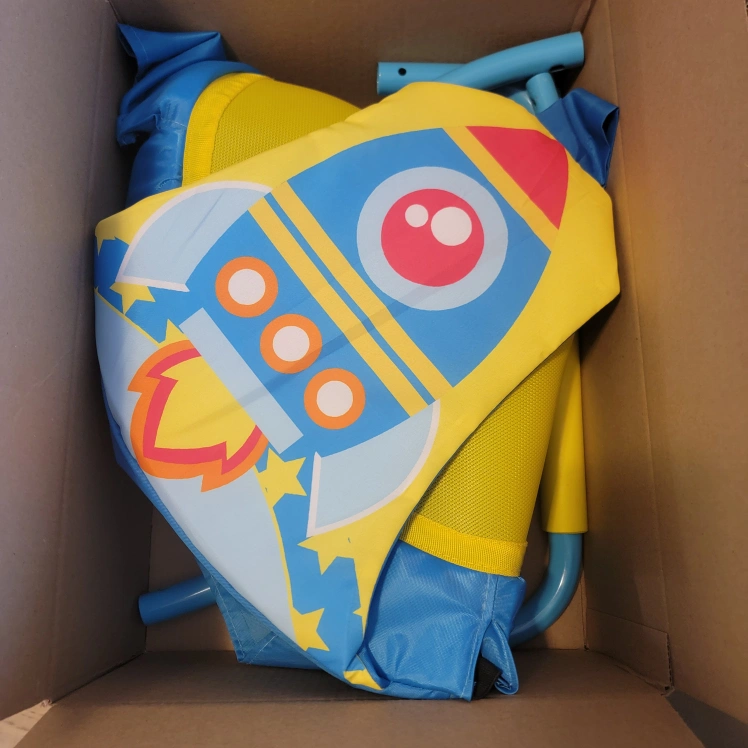 Mini indoor trampoline for toddlers. Rocket-themed design. Blue and yellow colours. Suitable for ages 6 months to 4 years.