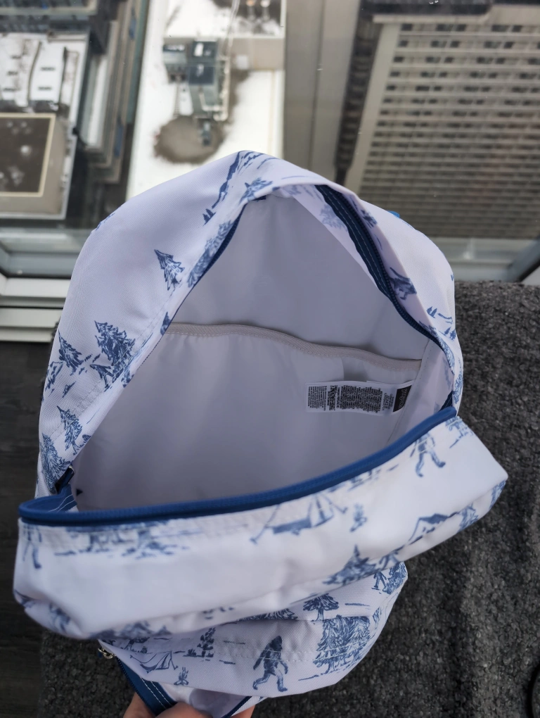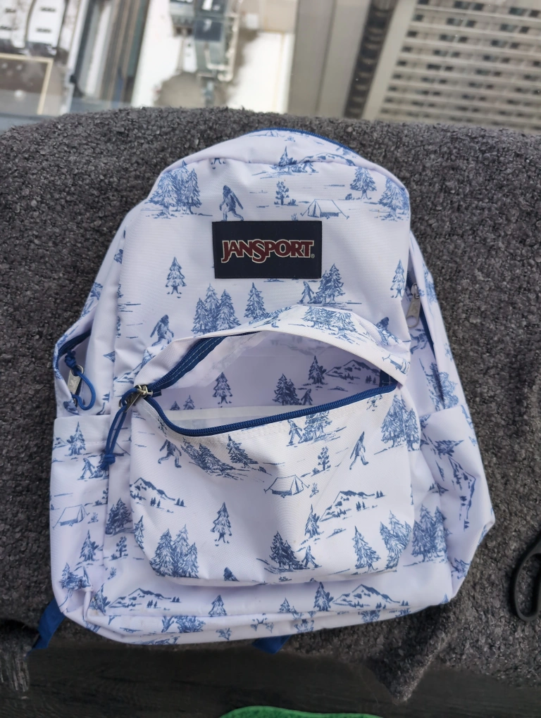 JanSport Superbreak white and blue backpack, barely used. Sasquatch forest print. Front zip pocket. Internal padded laptop compartment for 15" device. RRP $40