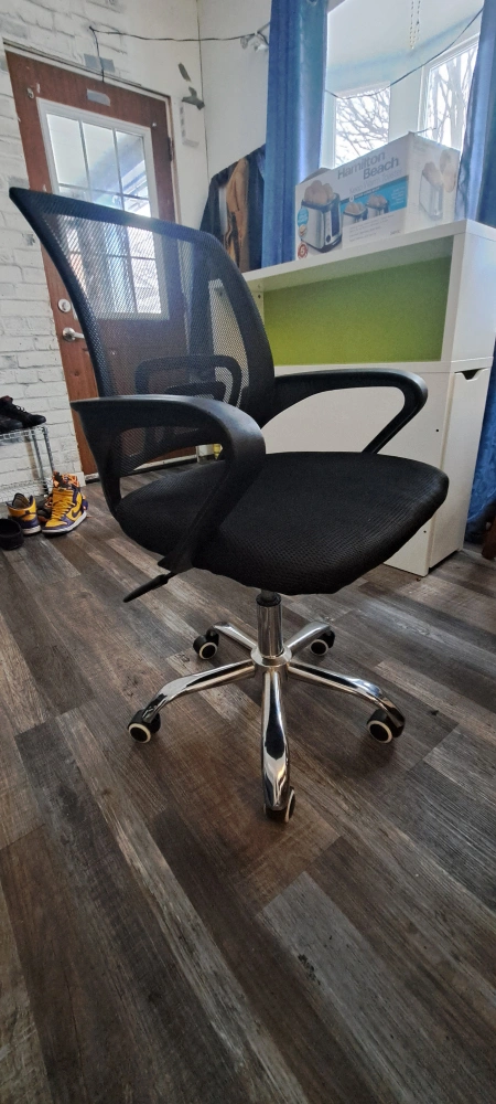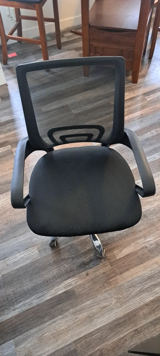 Comfortable office chair. Mesh back and seat. Adjustable height. Five rolling casters. Black plastic armrests. Chrome base. New condition, never used.