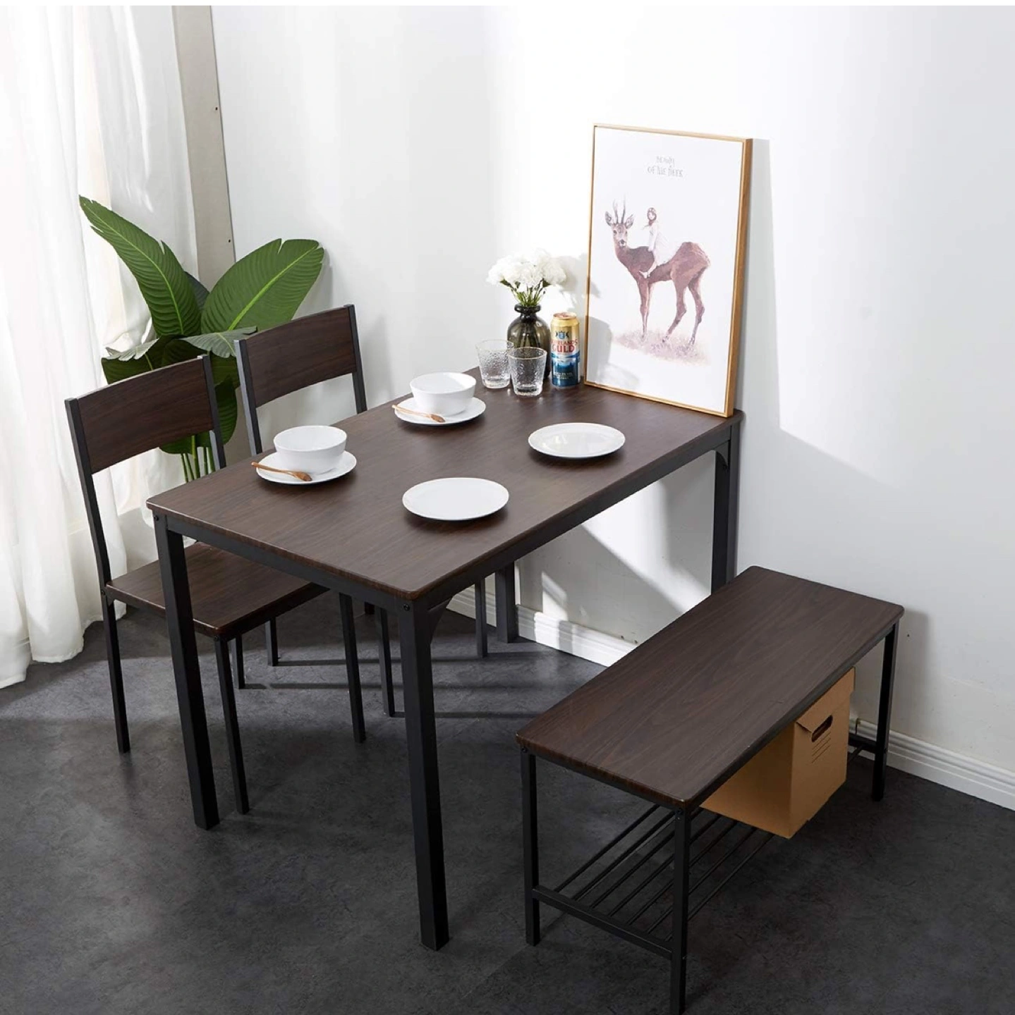 Five-piece dining set. Includes table, two chairs and bench. Walnut finish, black metal.