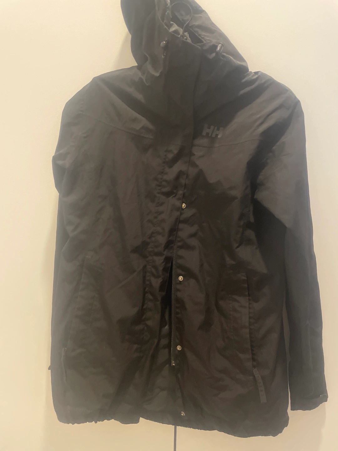 Black Helly Hansen jacket. Size small. Features a hood and snap closures. Good condition.