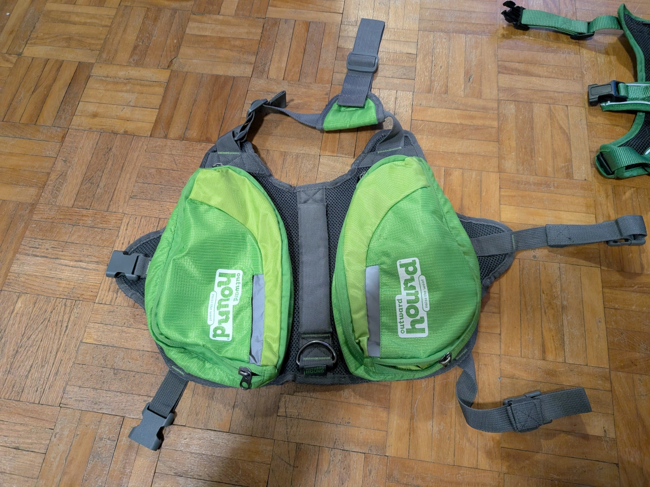 Pockets are big so can carry quite a bit of weight. medium sized dog.