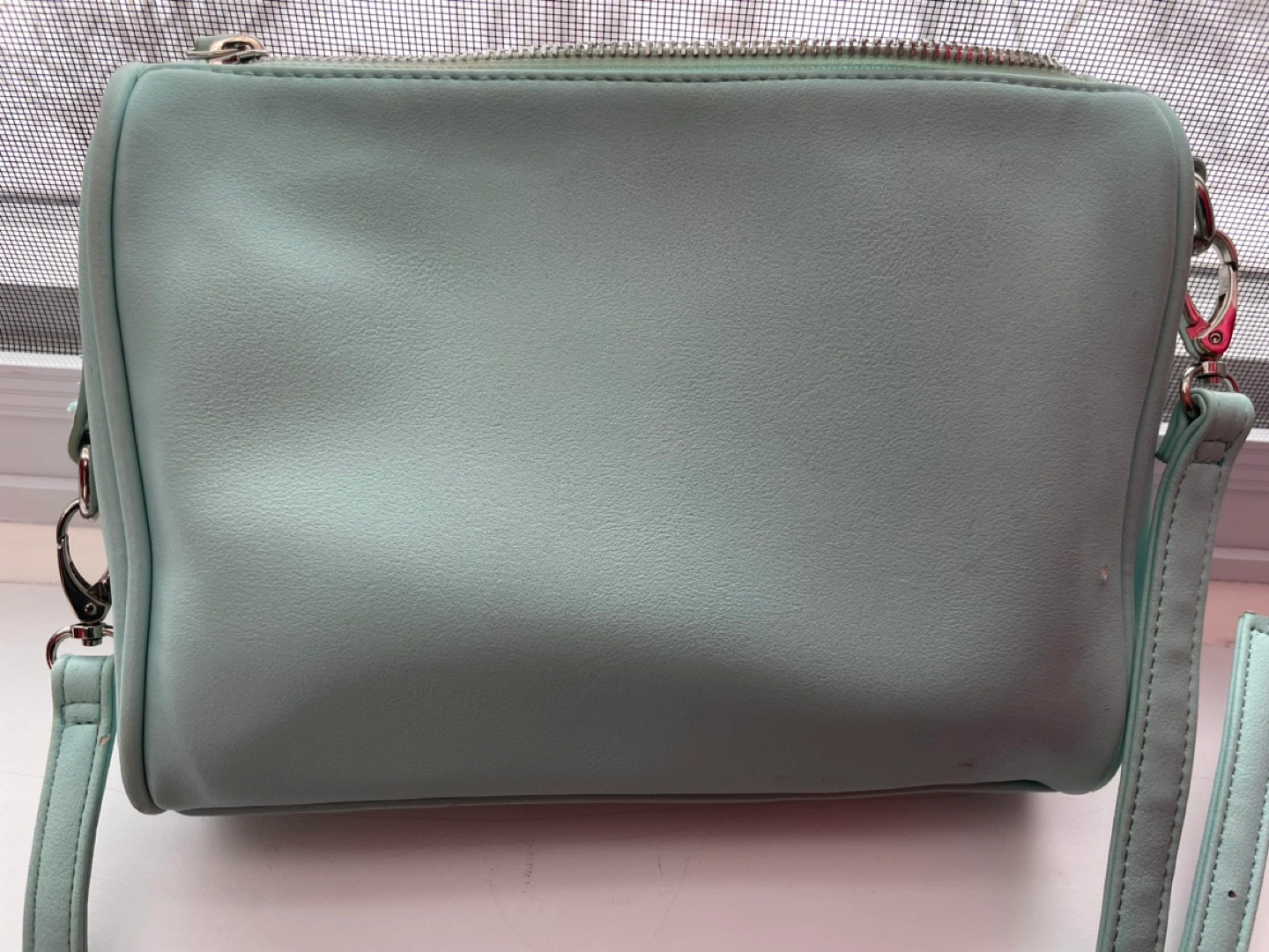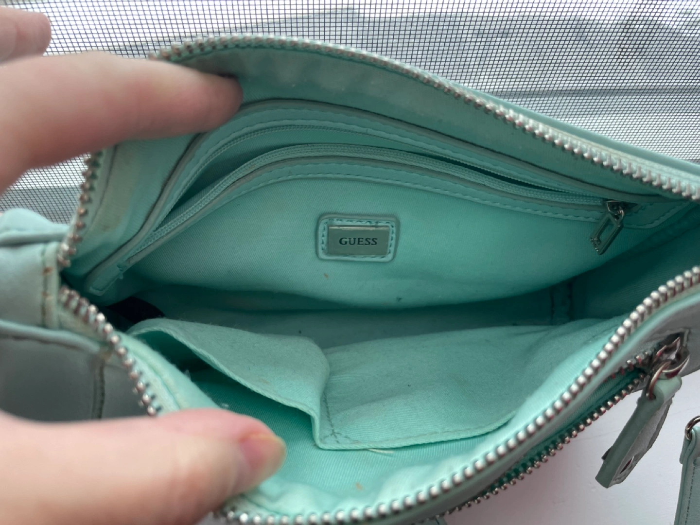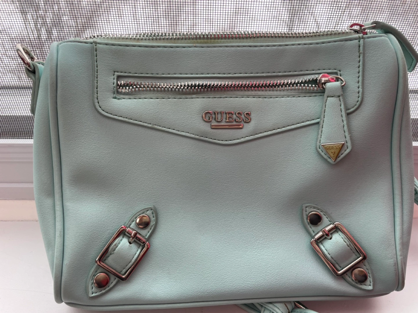 Adorable mint green Guess crossbody bag. Features silver hardware, multiple zipper compartments, and an adjustable strap. Perfect for everyday use.