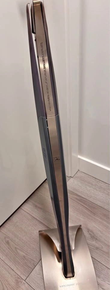 Great piece of Vancouver history! Only about 600 Paralympic torches were created and this is one of them. Original owner and used for relay in Hope BC. Engraved with the motto 'With Glowing Hearts/ Des plus brilliants exploits' with a Canadian maple leaf cut out on the opposite side of the torch. Comes with the original box and carrying bag as well as the torch stand.