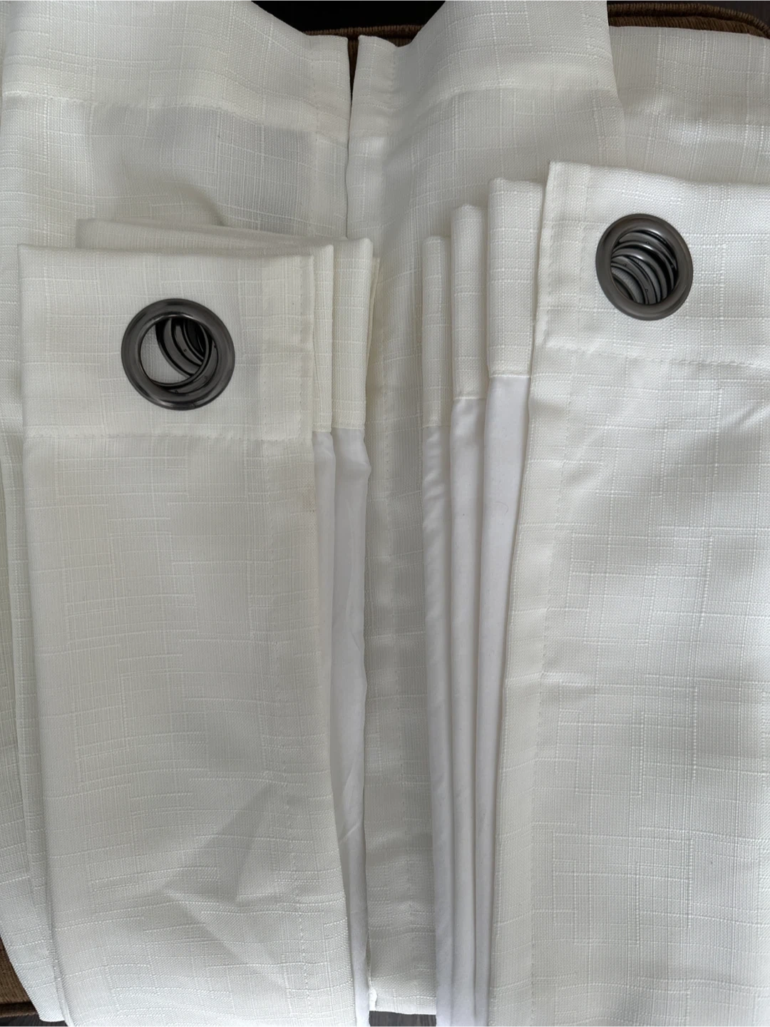 Set of two 52W x 84L inches off-white curtains with grommets. They feature a textured weave. Fabric material is polyester. Originally purchased from Bouclair. Clean, no stains. They are not room darkening.