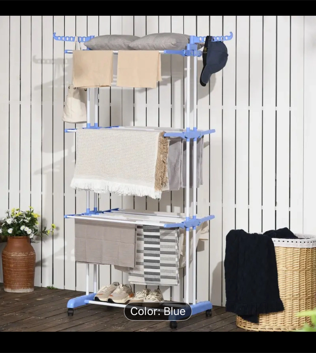 A foldable clothes drying rack. Features multiple tiers and rails. Perfect for drying clothes indoors, ensuring a tidy and organized space, offering a calming effect for your home.
