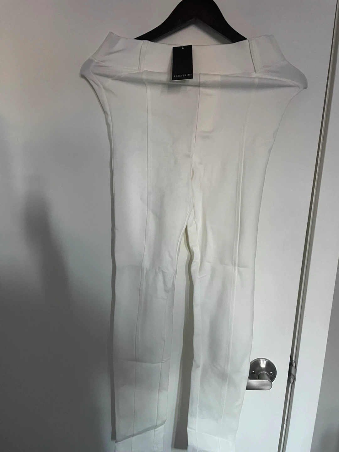 These are white high-waisted pants from Forever 21. They feature a sleek, tailored design with a flattering fit. The fabric is comfortable and suitable for various occasions.The green pants are cotton and have a little stretch. Both pants are brand new with tags. Both pairs are sold together. Cash only. Pick up only.