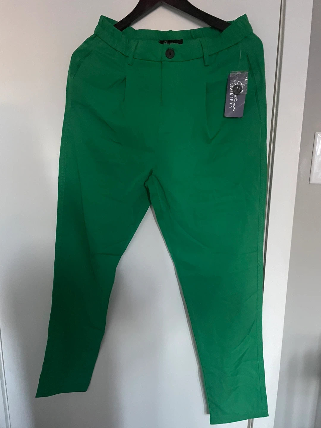 These are white high-waisted pants from Forever 21. They feature a sleek, tailored design with a flattering fit. The fabric is comfortable and suitable for various occasions.The green pants are cotton and have a little stretch. Both pants are brand new with tags. Both pairs are sold together. Cash only. Pick up only.
