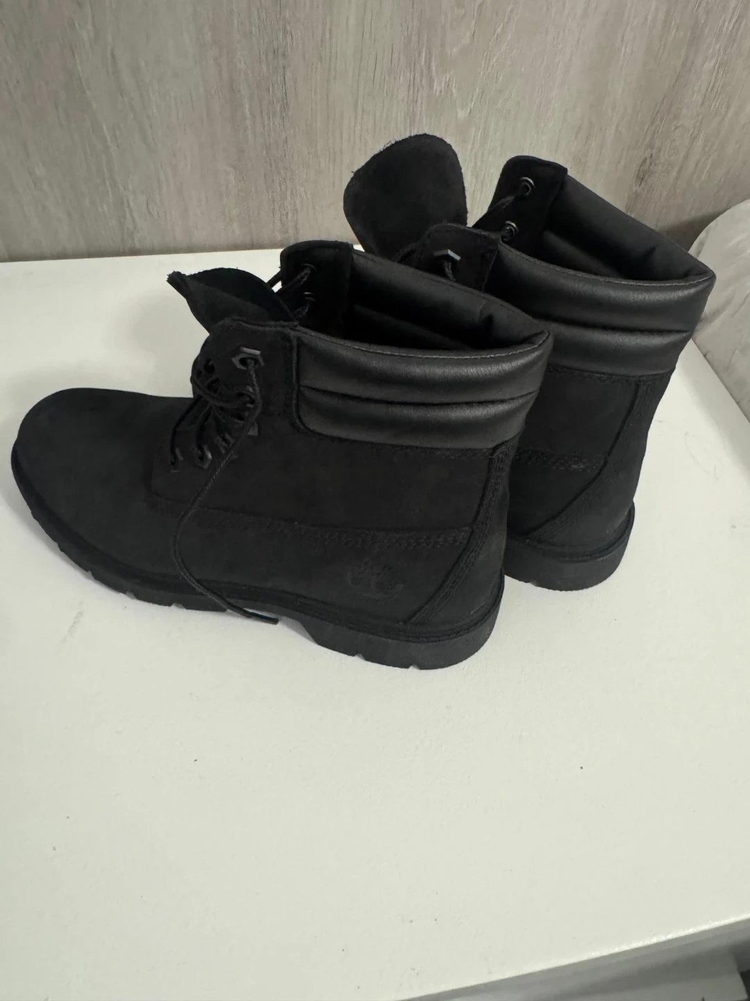 Timberland women's black lace-up boots. Features a durable nubuck leather upper and a lug sole for traction. Includes OrthoLite footbed for cushioning. Made in Bangladesh. #7