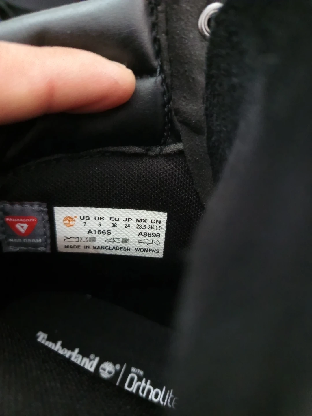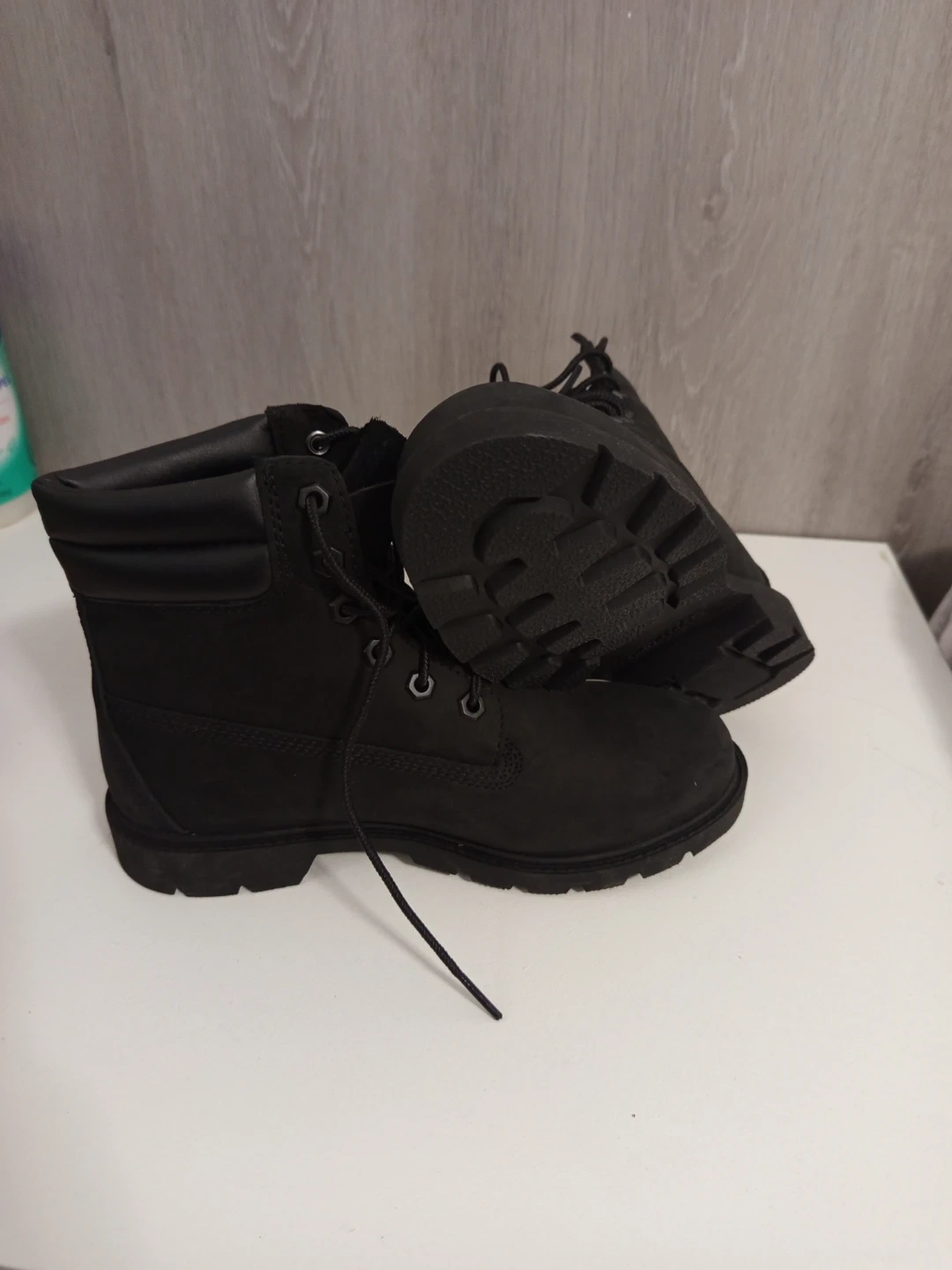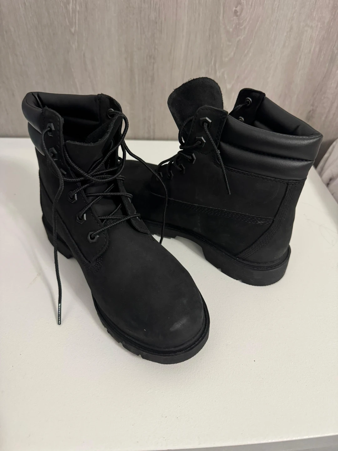 Timberland women's black lace-up boots. Features a durable nubuck leather upper and a lug sole for traction. Includes OrthoLite footbed for cushioning. Made in Bangladesh. #7