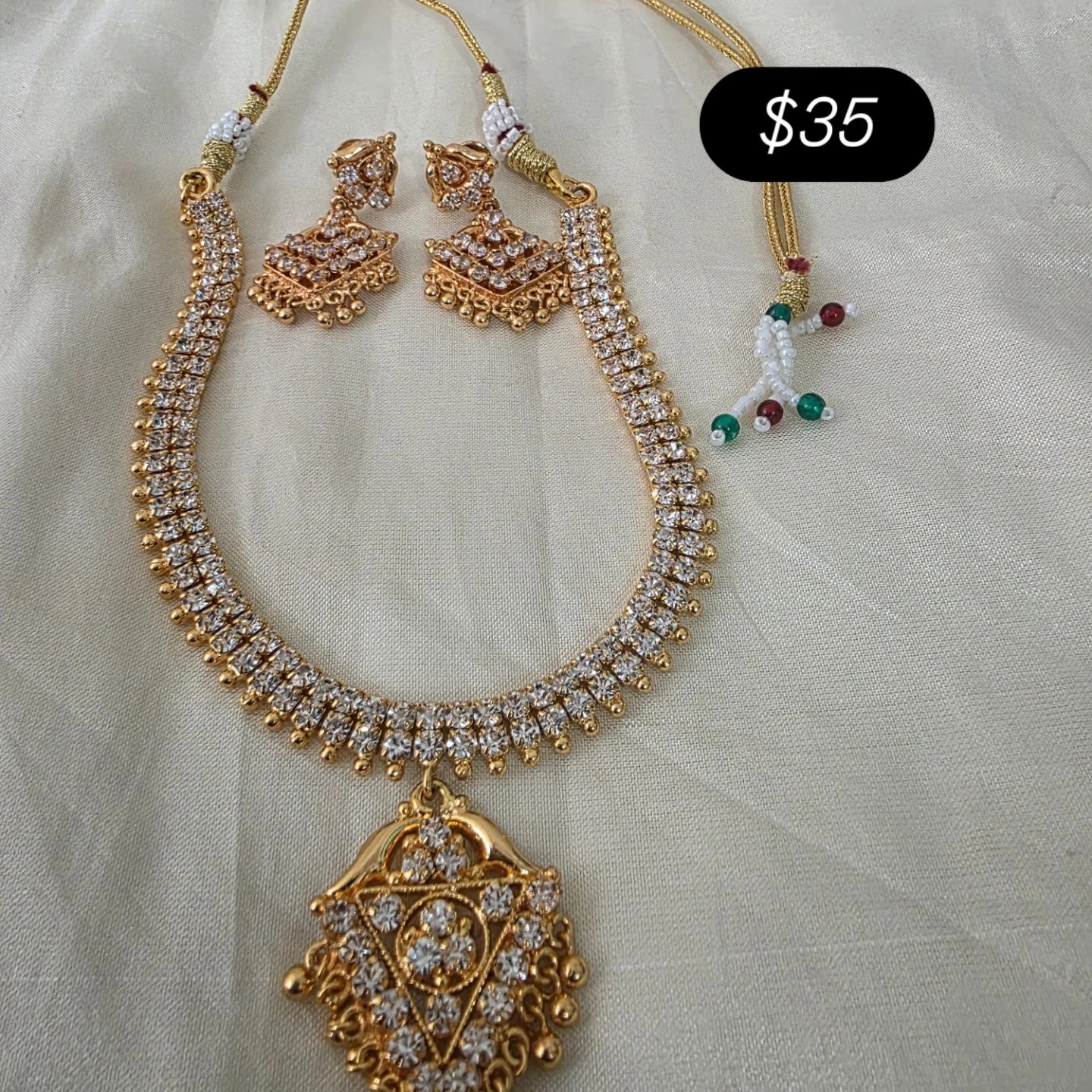 This is a gold-tone necklace and earring set. It's adorned with clear rhinestones and features a large pendant. The earrings are a matching dangle style.