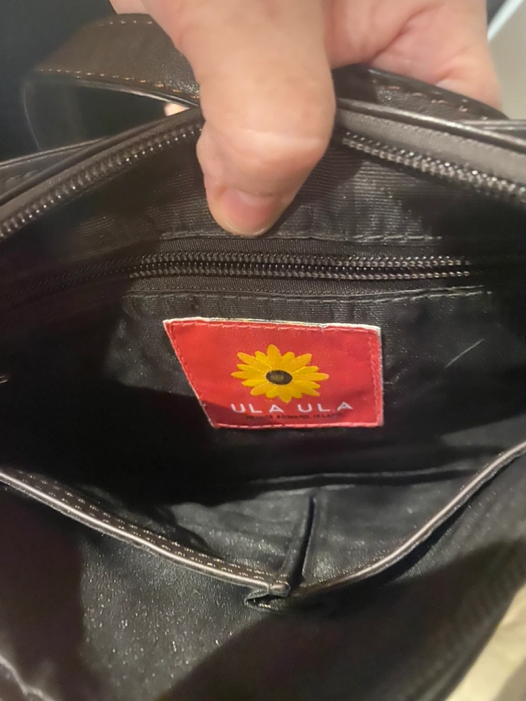 This is a ULA ULA brown leather crossbody bag. It's made of genuine leather and has a flower emblem on the front. Interior features a zippered pocket.