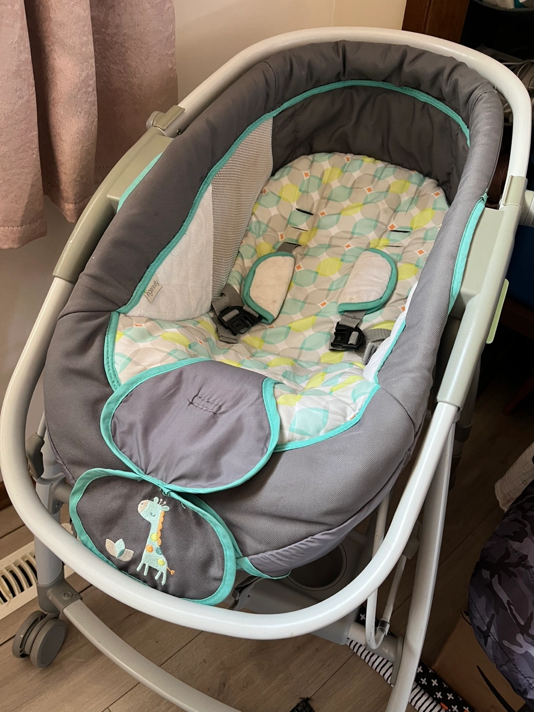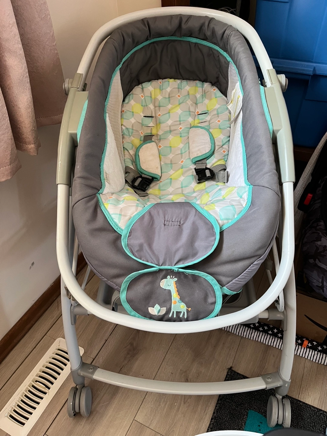 Used baby chair, grey and teal colours. Features a soft padded seat, vibrating function, and wheels for easy portability. Suitable for newborns and infants.