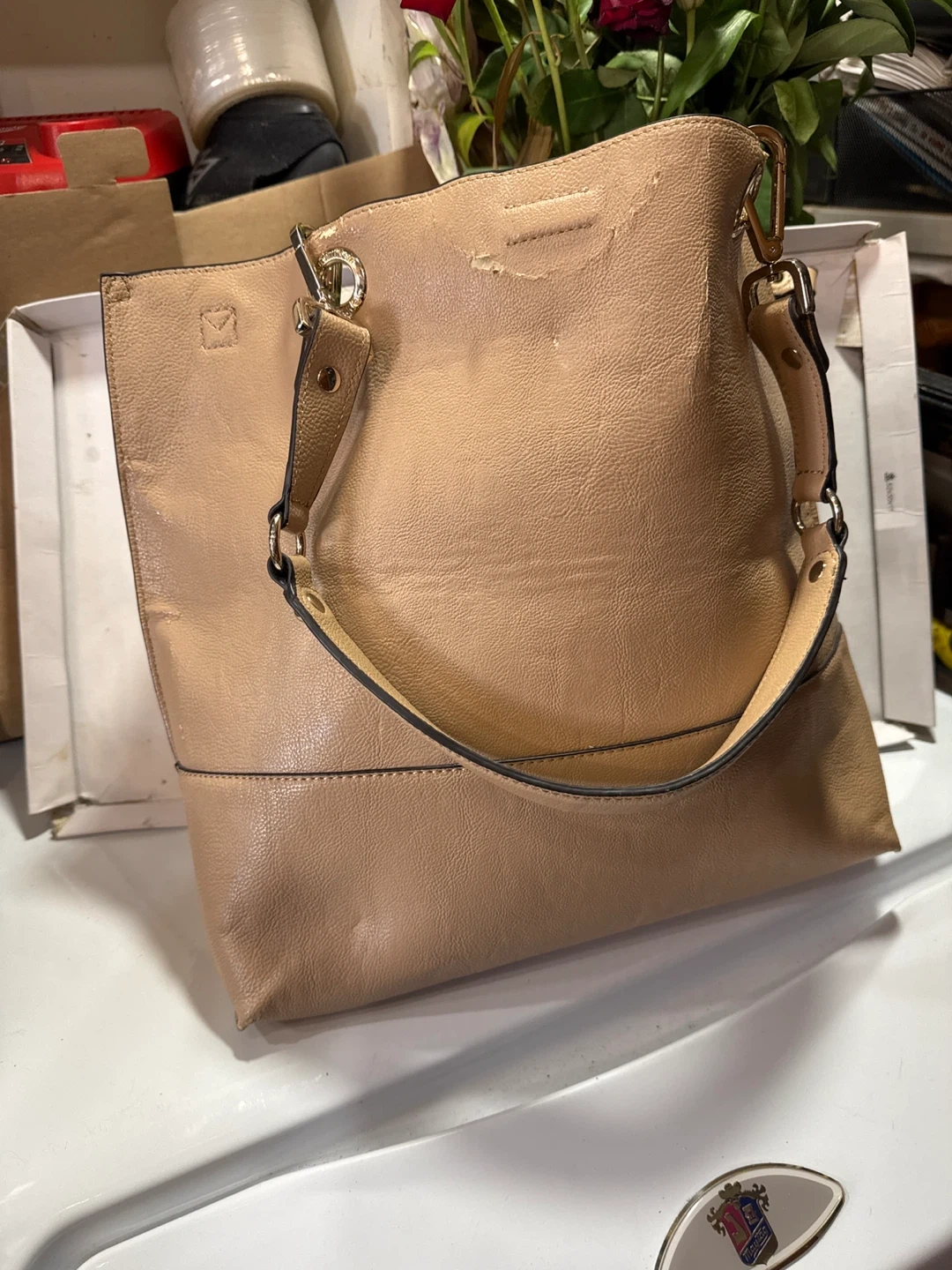 The Calvin tote also has a few character flaws on the outside. It’s got a little cracking where the creases were stayed folded during storage and there’s a couple of nicks here and there on the person in a little bit of flaking in the center of the backside other than that inside is great overall purse is still integral still solid. You can still kick up your heels and hit the town with it.