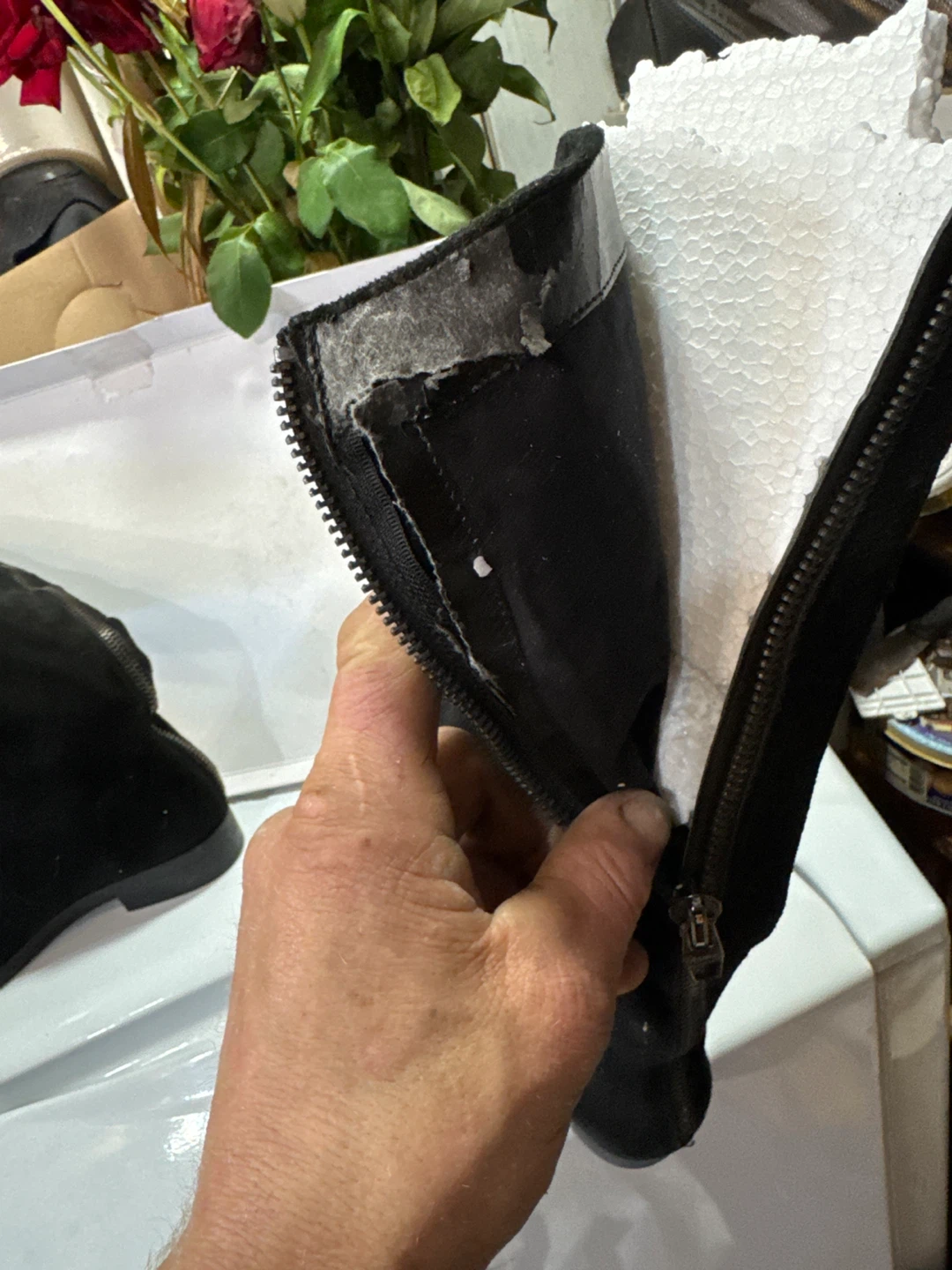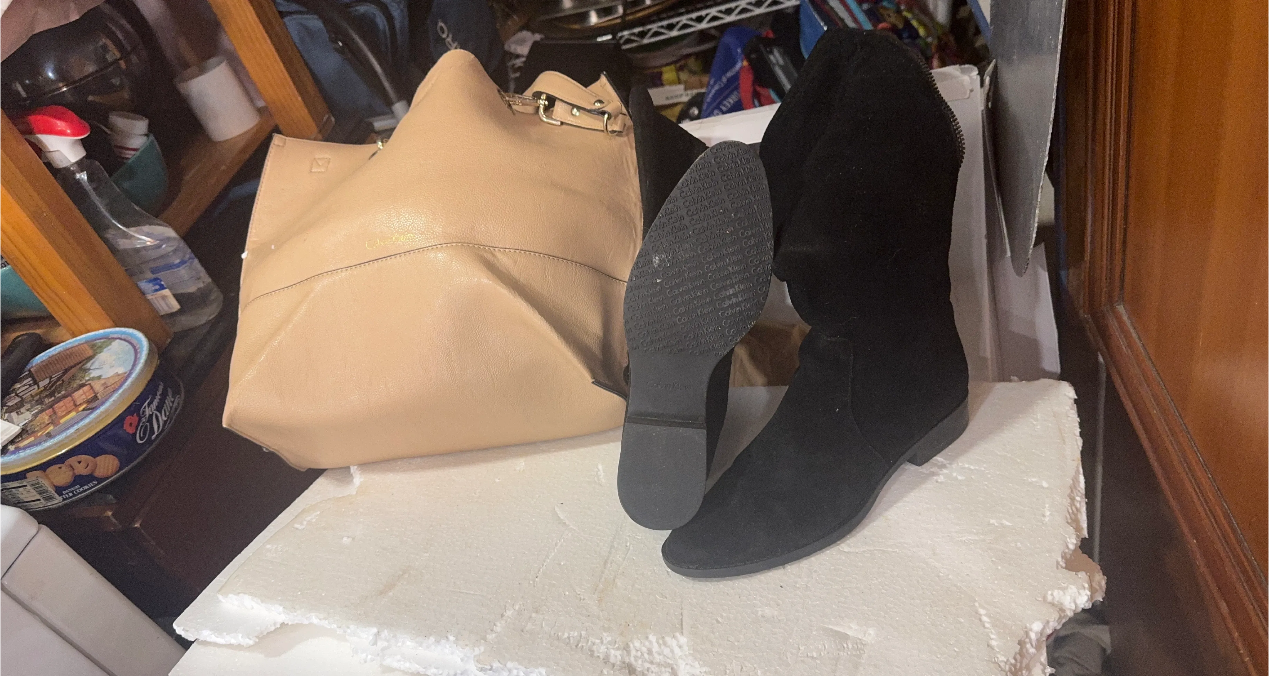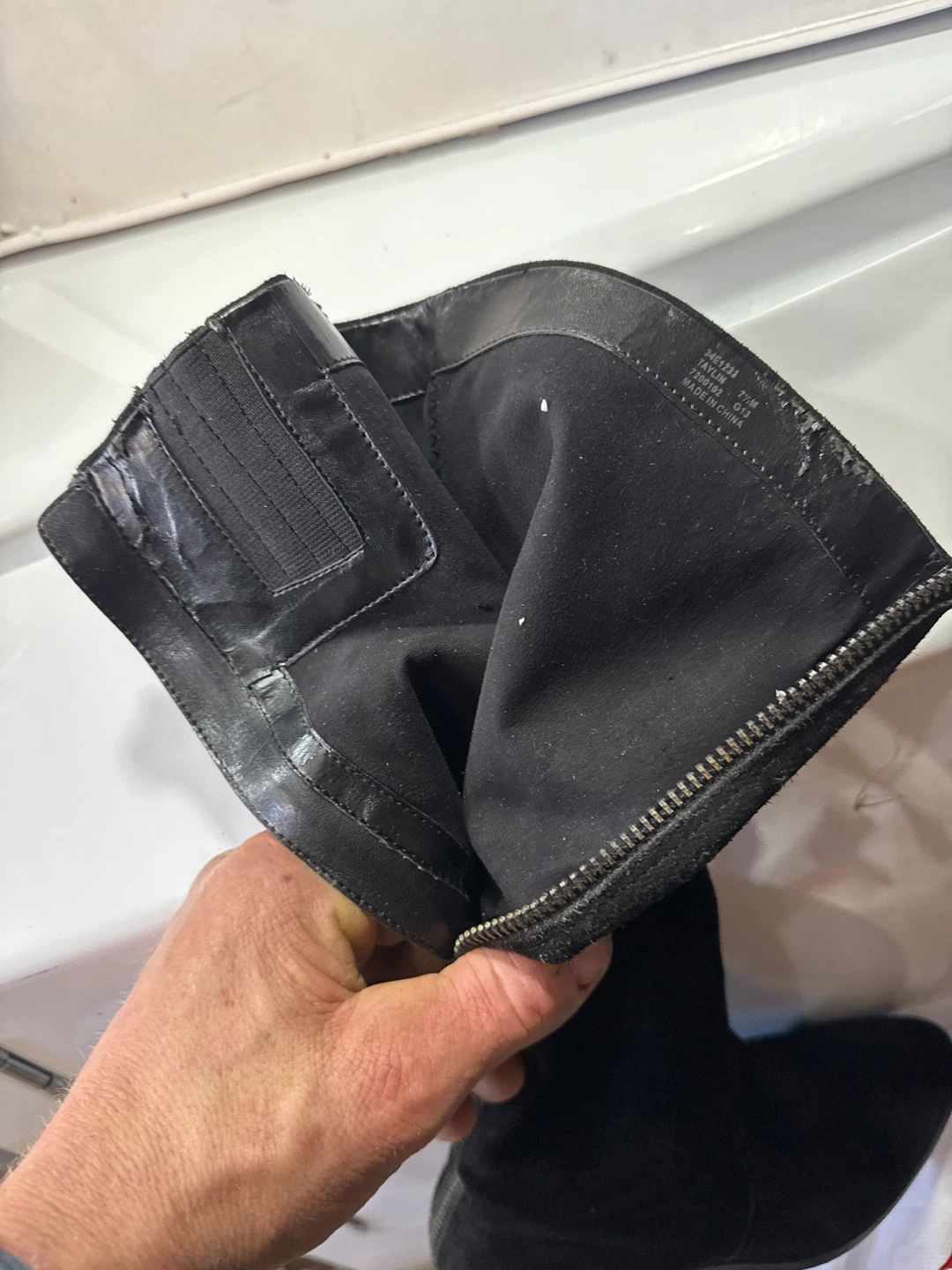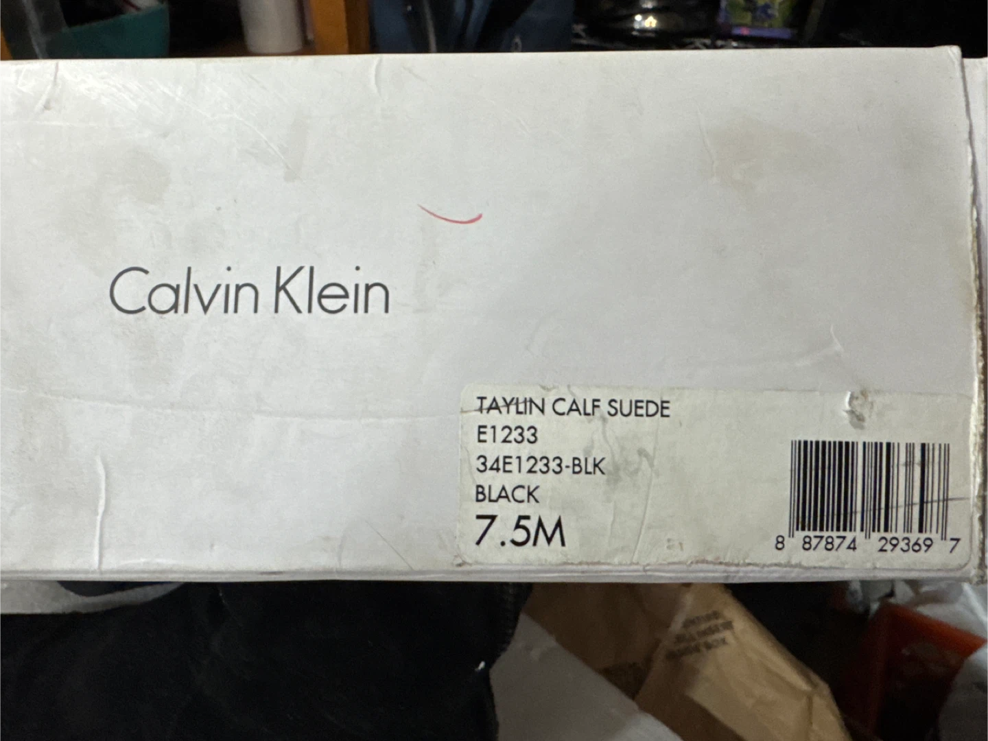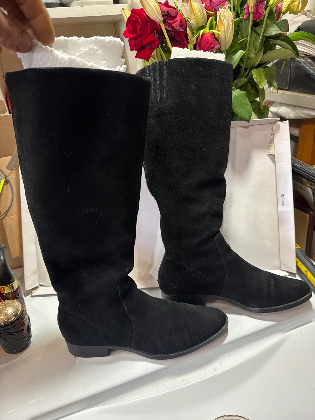 Selling a combo set of a pair of Calvin Klein Taylin calf suede boots in black. They're a size 7.5M and come with the original box! Along with/ a Calvin Klein tote bag. The boots are in great shape on the outer side . No nick scratches or cuts. On the inside (as you can see in the pics) there is damage to the top suede. It does not show from the out side.