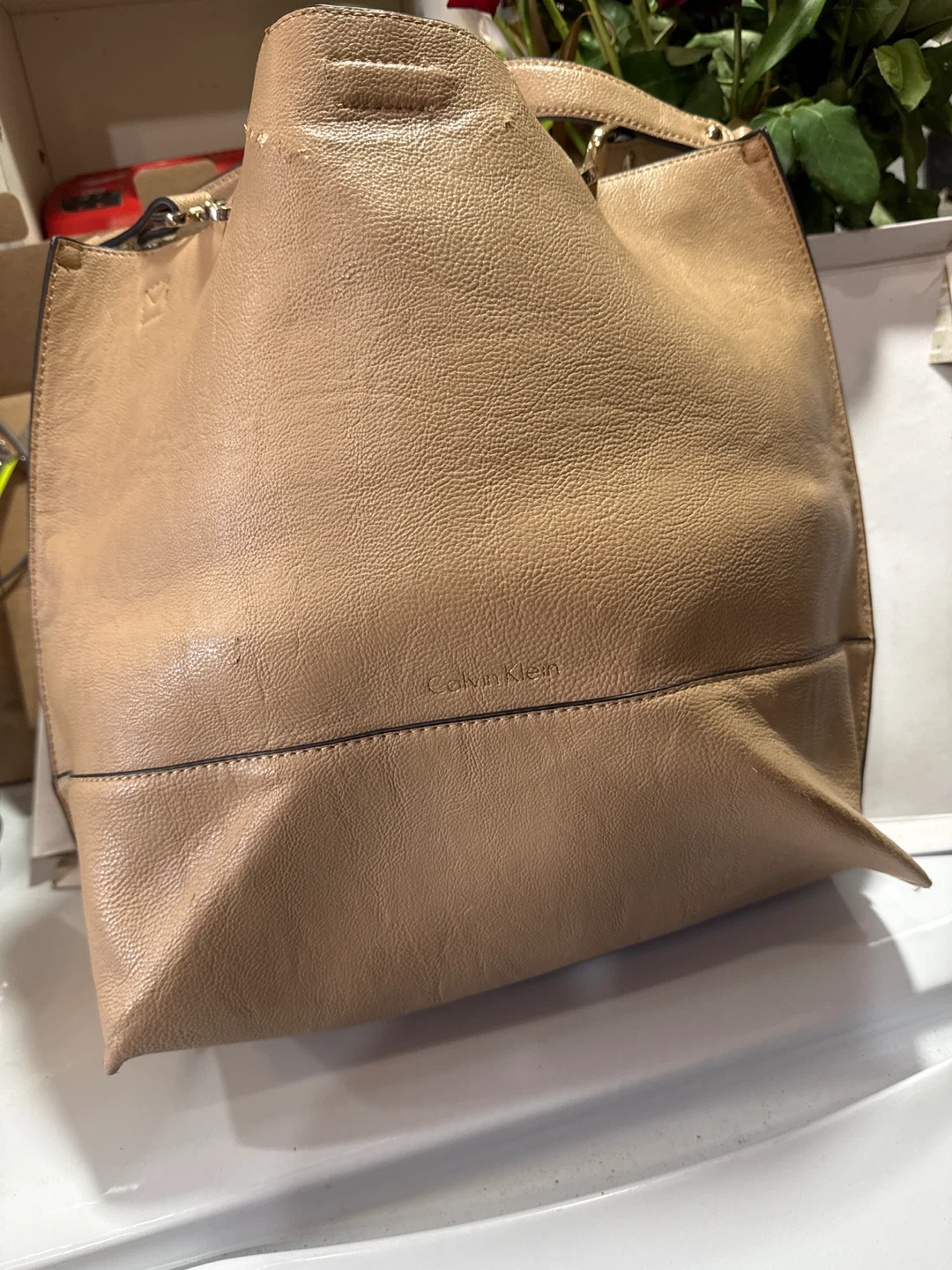 The Calvin tote also has a few character flaws on the outside. It’s got a little cracking where the creases were stayed folded during storage and there’s a couple of nicks here and there on the person in a little bit of flaking in the center of the backside other than that inside is great overall purse is still integral still solid. You can still kick up your heels and hit the town with it.