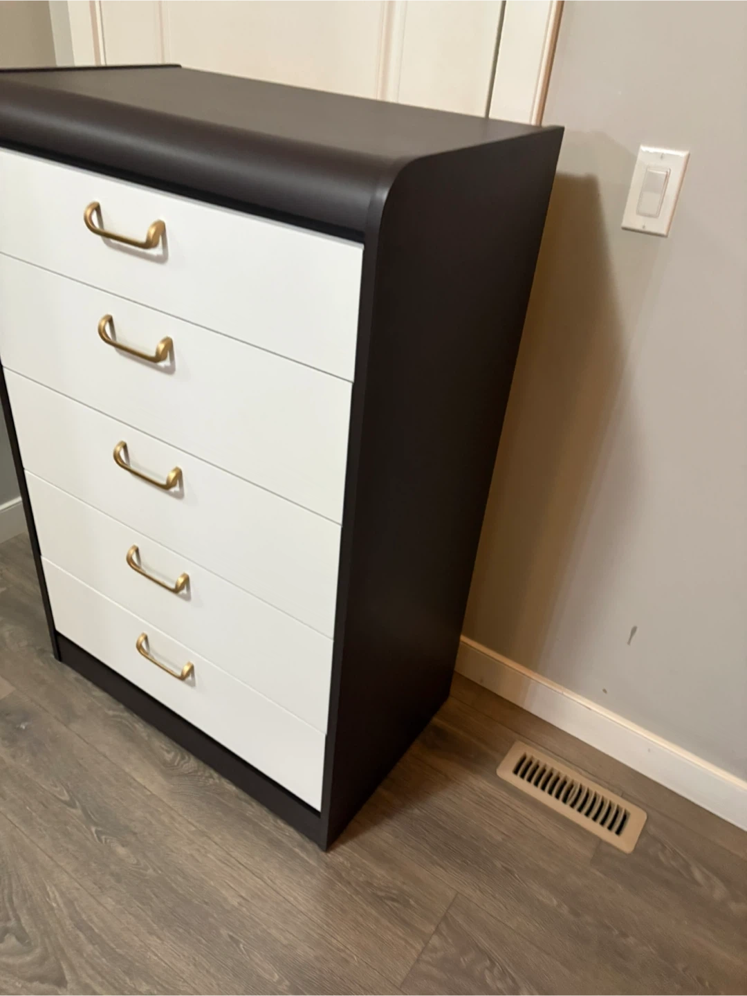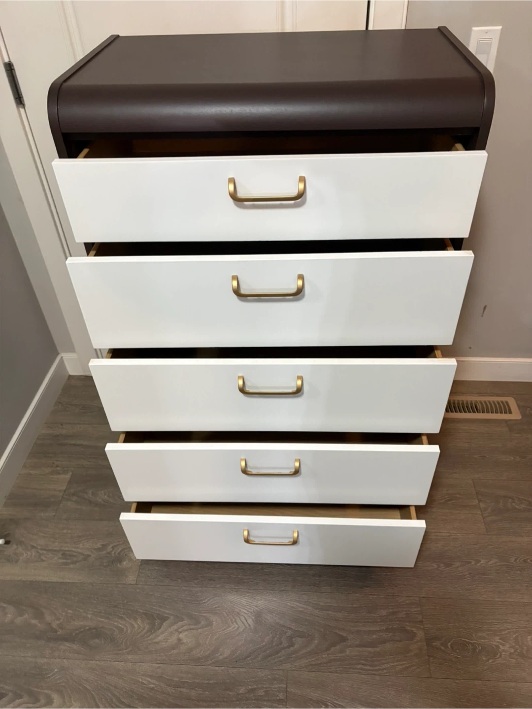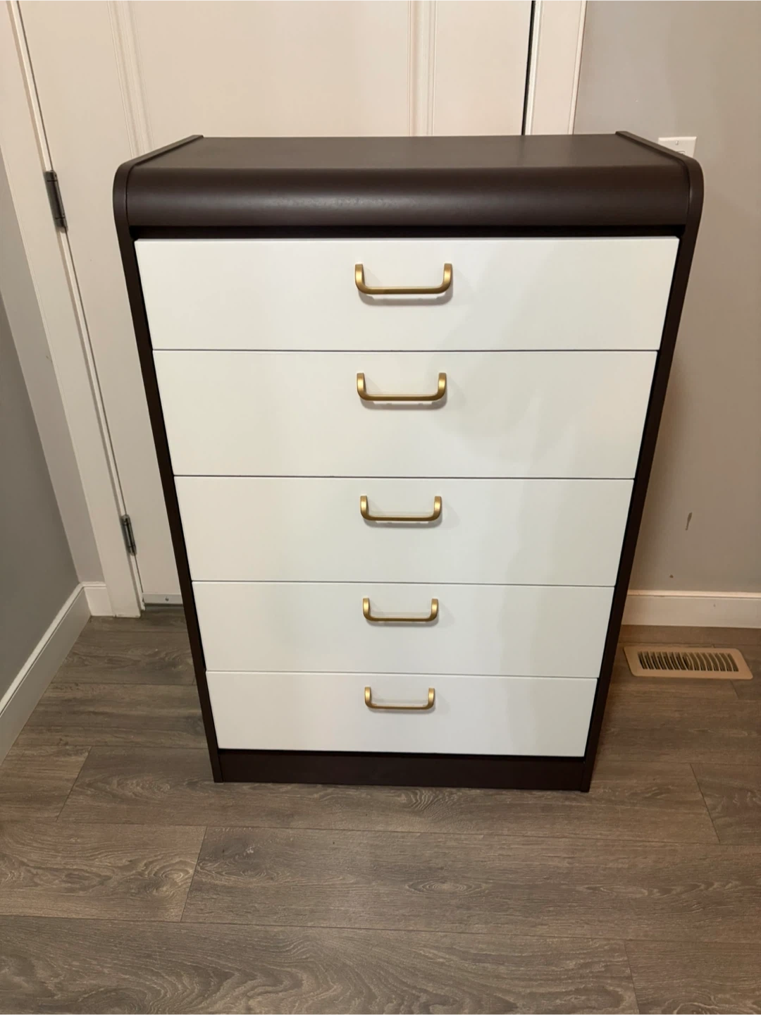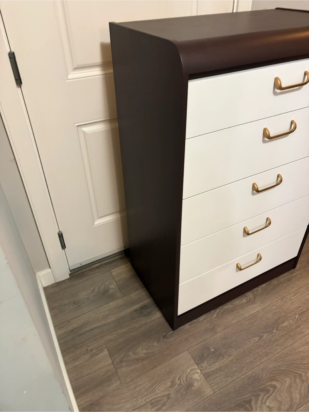 This stylish refinished brown dresser features five white drawers, each equipped with sleek gold handles. It's in excellent condition. It is a functional and eye-catching piece of furniture. The drawers are very clean and slide smooth.