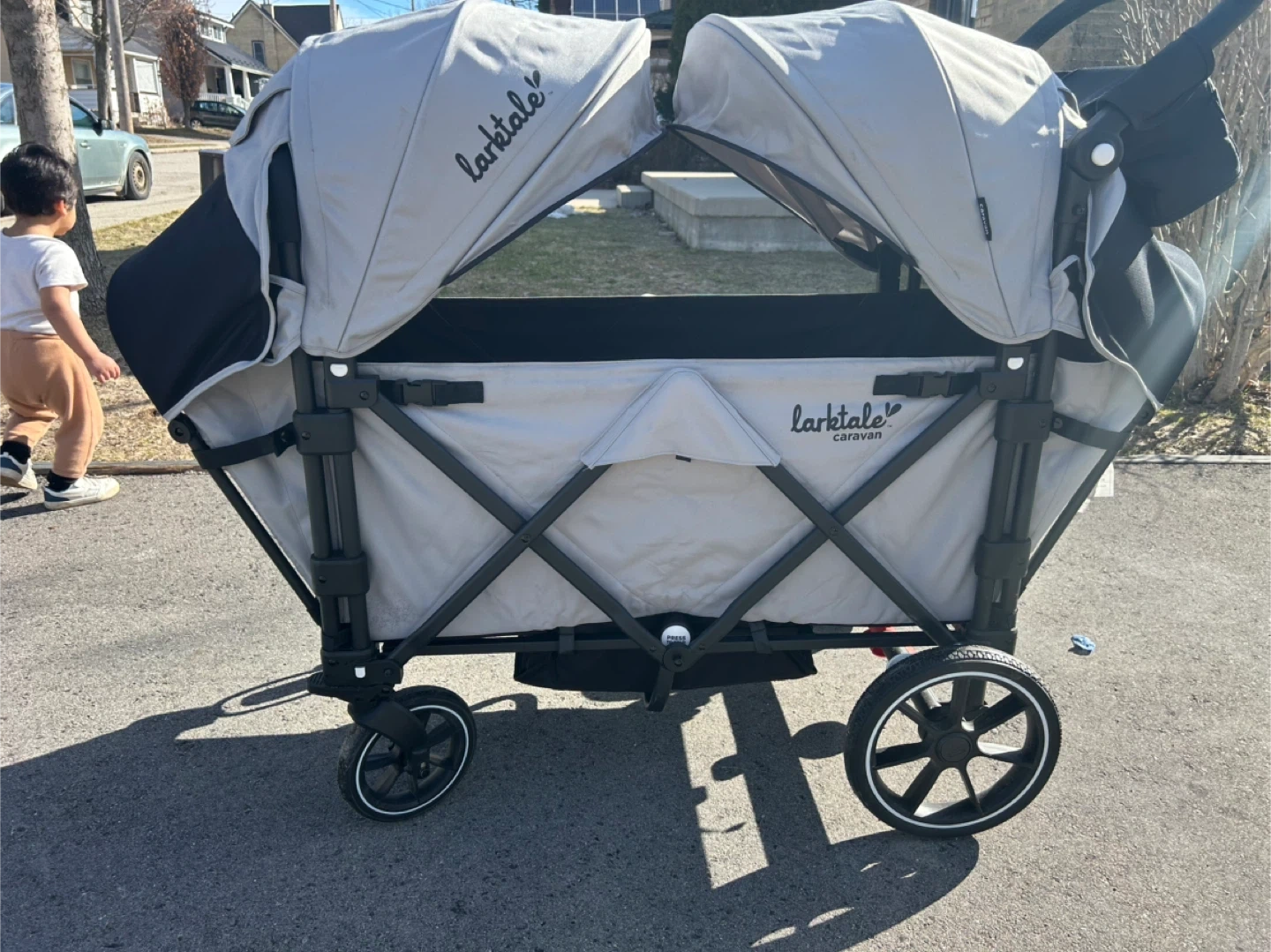 This Larktale Caravan wagon is designed for two kids. It features a foldable frame for easy storage. The wagon includes safety harnesses for secure seating. It's great for trips to the park or running errands with your little ones!