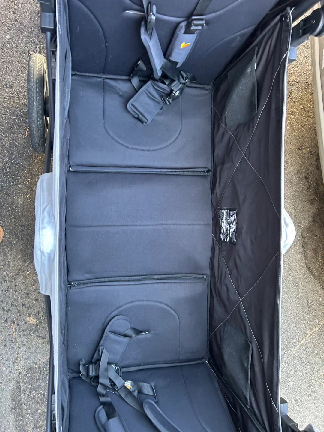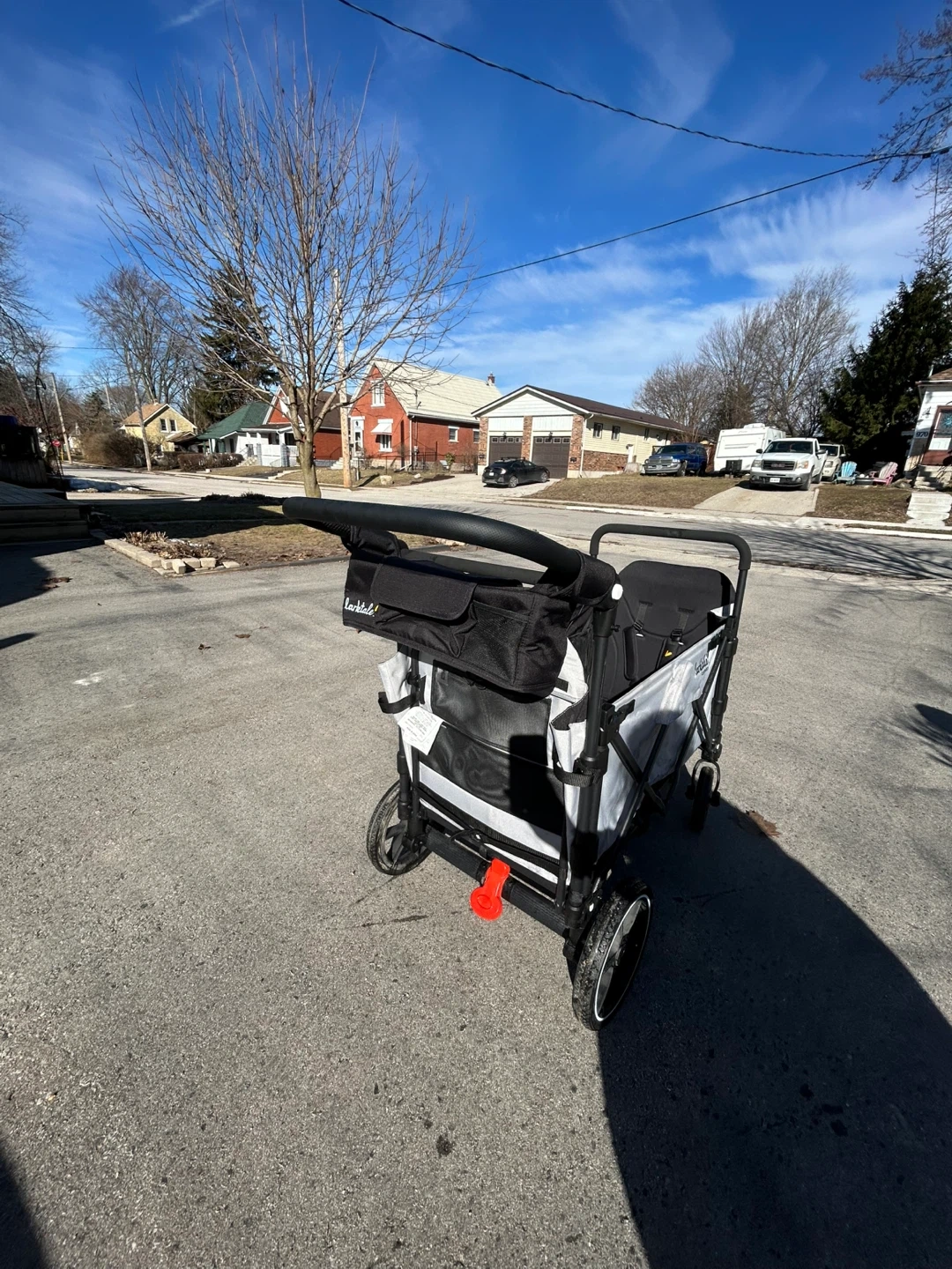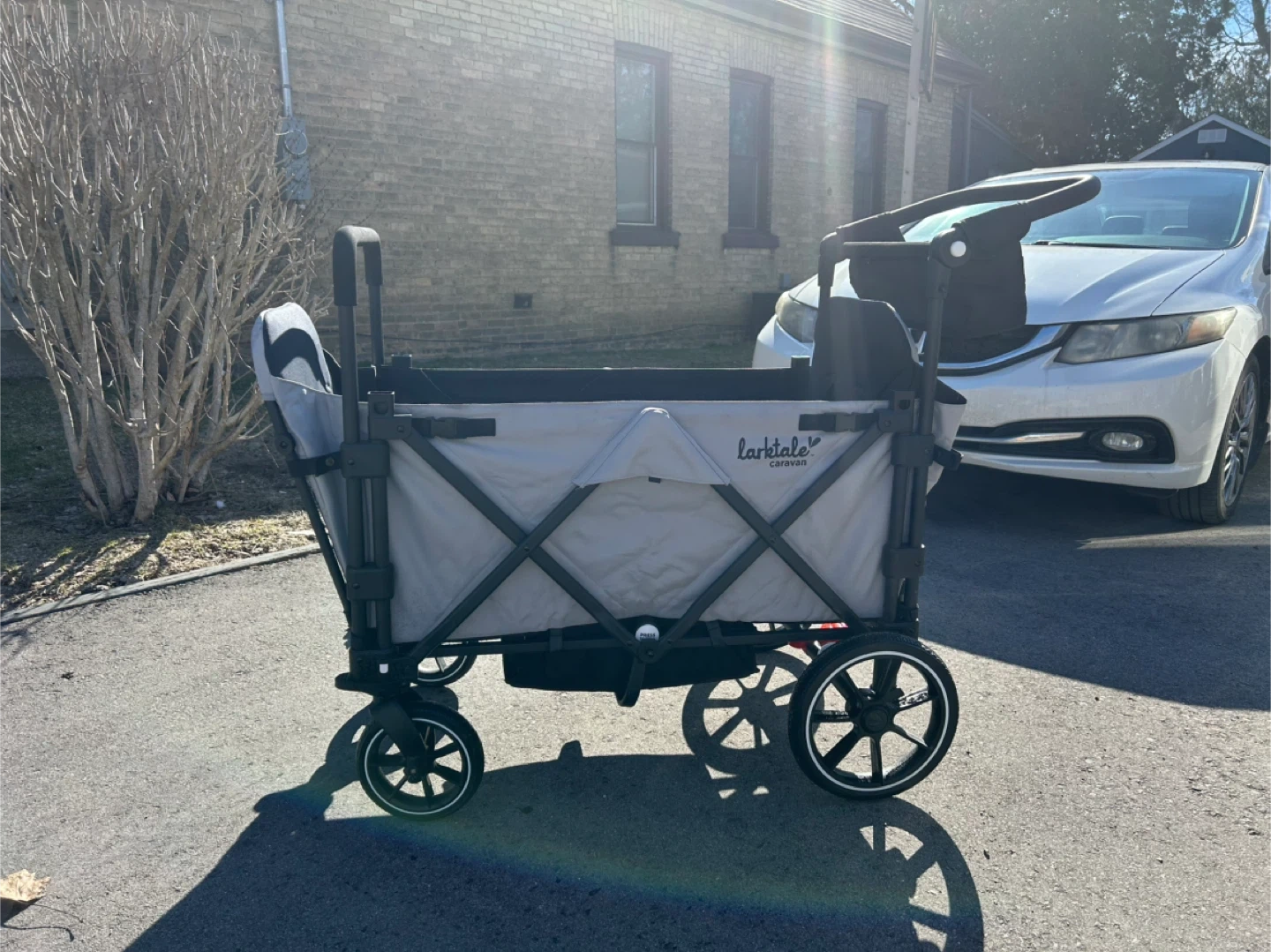 This Larktale Caravan wagon is designed for two kids. It features a foldable frame for easy storage. The wagon includes safety harnesses for secure seating. It's great for trips to the park or running errands with your little ones!