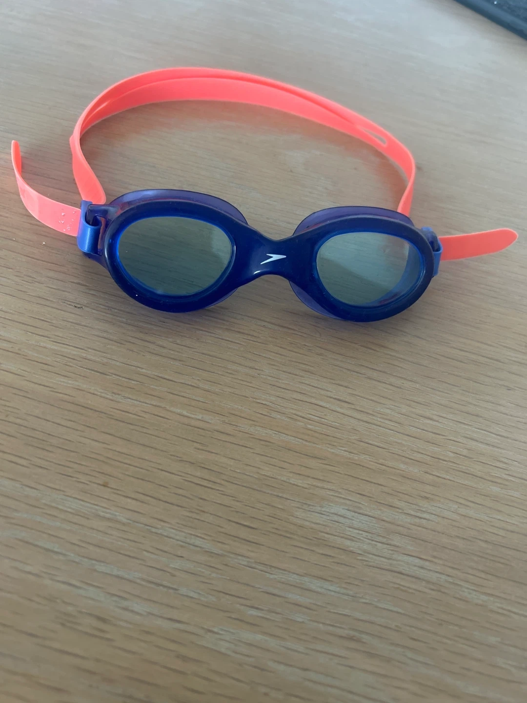 Speedo swim goggles in blue with an orange strap. These goggles are designed for swimming. Adjustable strap for a secure fit.