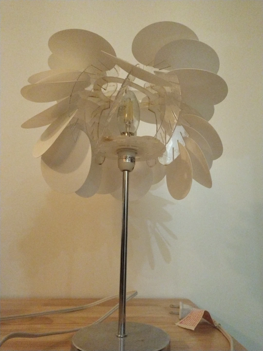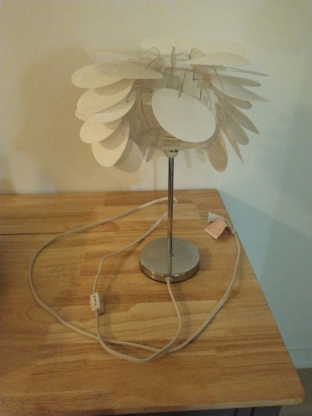 This table lamp has a unique design with white petal-like shades. It's a great way to add a decorative touch to any room. The lamp uses a standard bulb and has an on/off switch on the cord. It works perfectly fine just missing petal-like pieces as shown I photo. Potentially a great DIY project for someone creative.