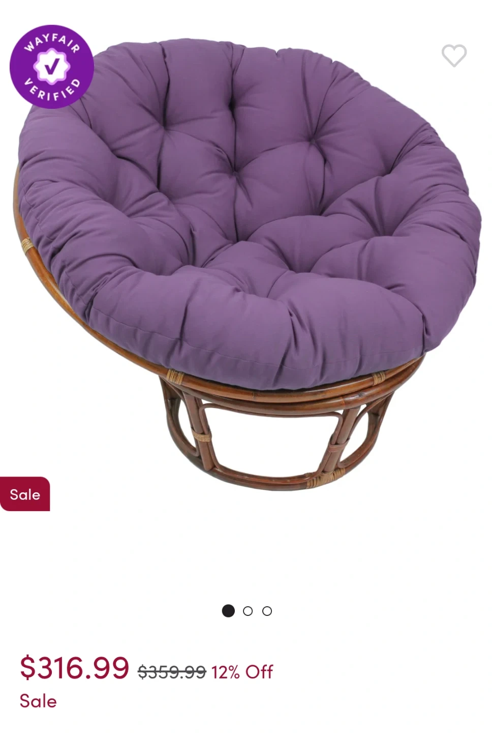 Selling a comfy Papasan chair with a purple cushion. It's in great shape and ready for a new home. Originally bought for $359.99 but now looking to sell for $150