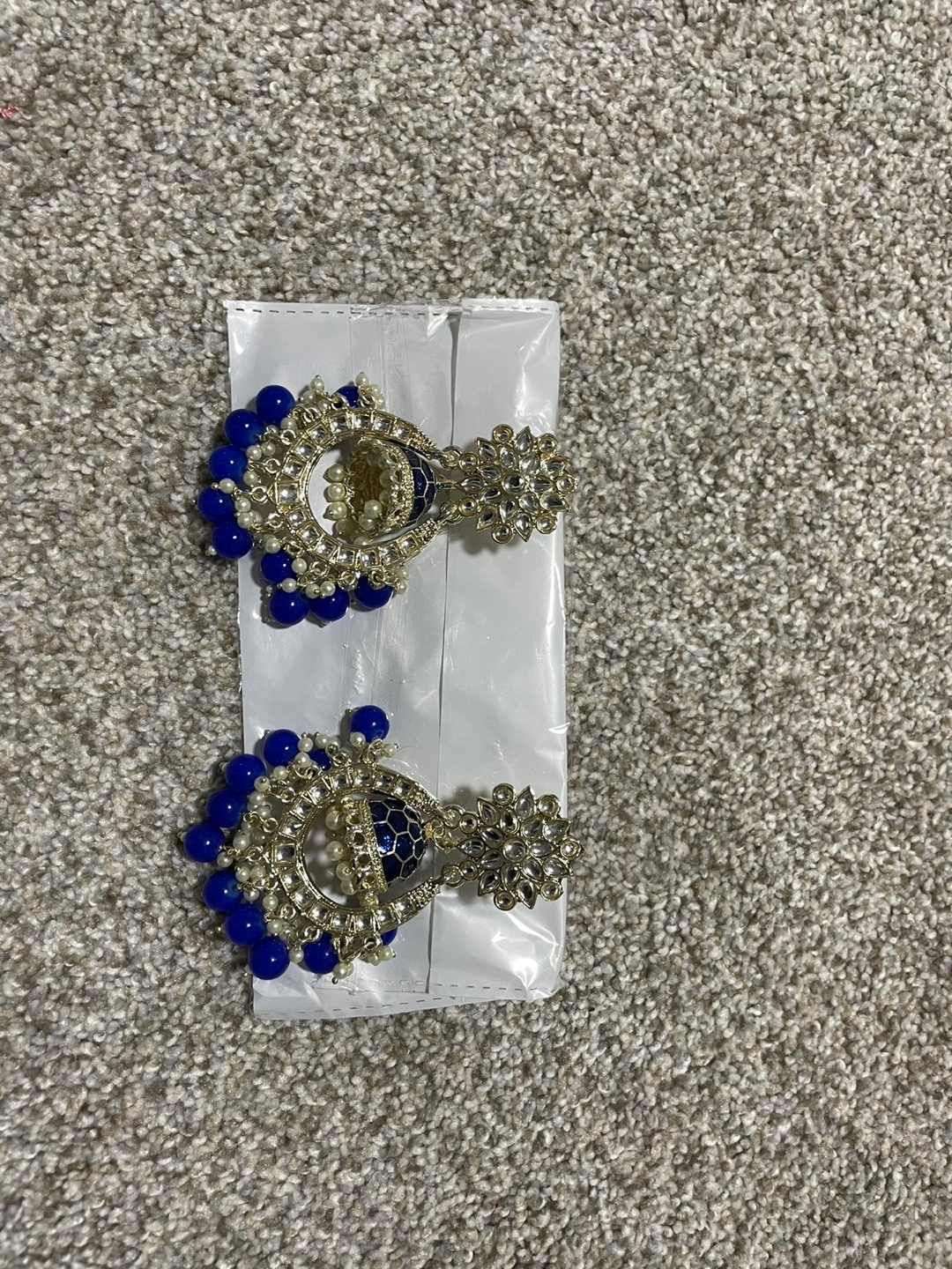 Beautiful pair of jhumka earrings. Features blue and gold detailing. Perfect for special occasions. Elegant design. More colour and design available