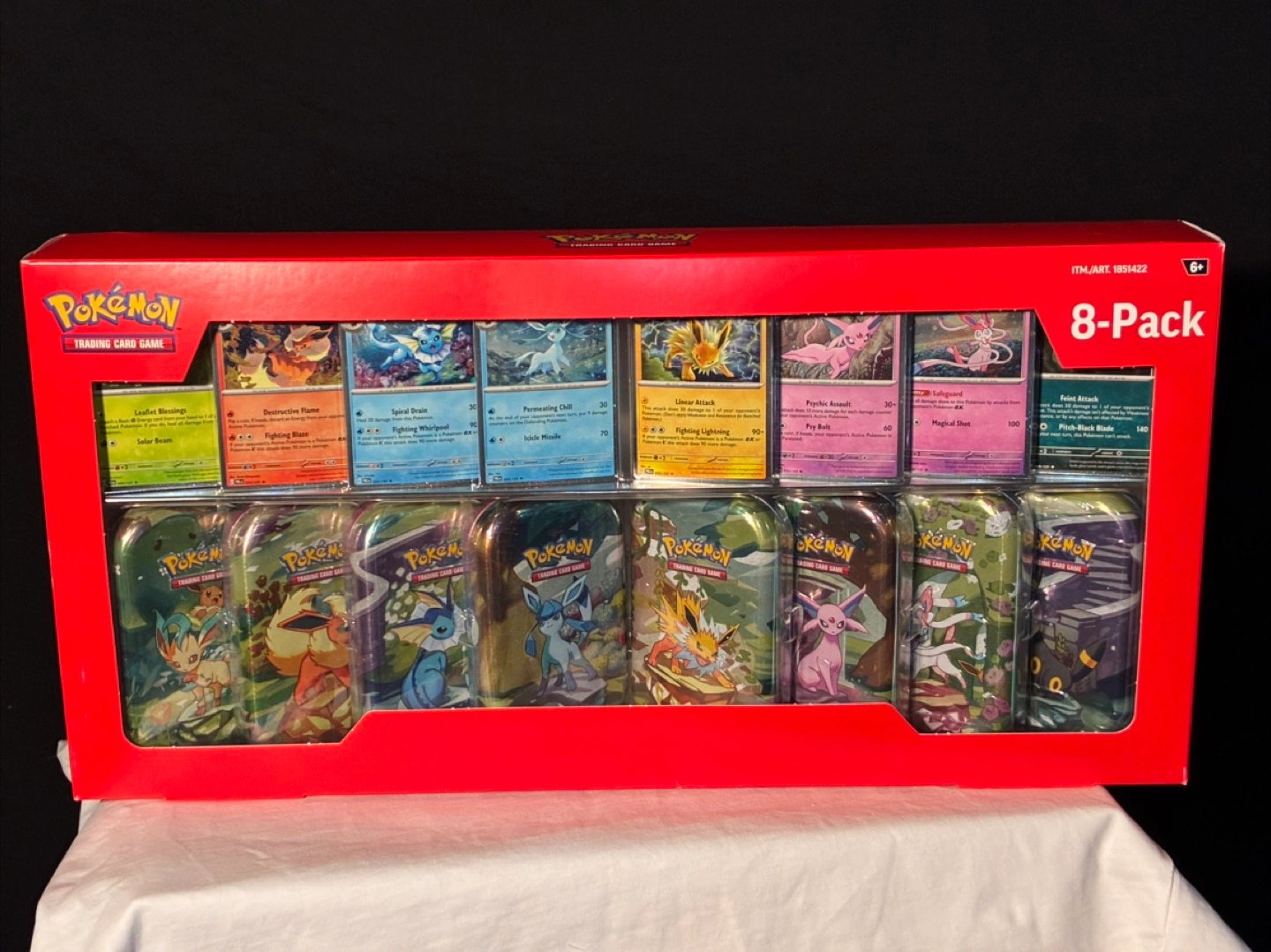 New and sealed 8-pack of Prismatic Evolutions mini tins. Discover the most exciting set from Pokémon Scarlet and Violet, perfect for collectors and players.