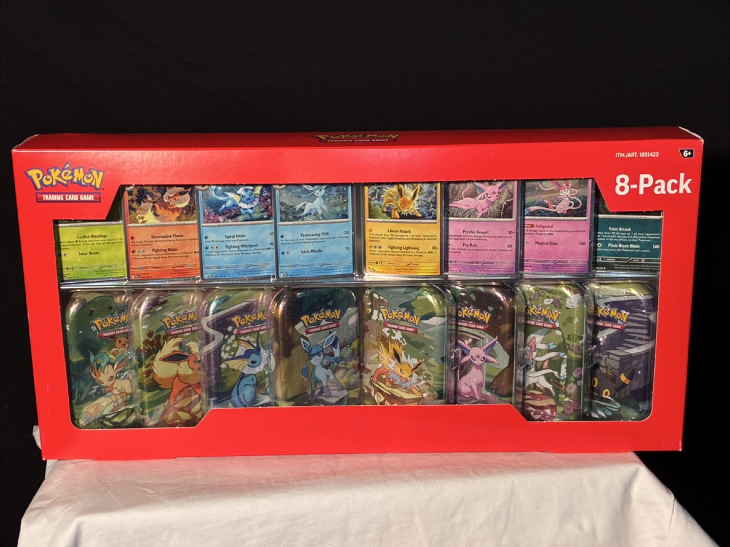 New and sealed 8-pack of Prismatic Evolutions mini tins. Discover the most exciting set from Pokémon Scarlet and Violet, perfect for collectors and players.