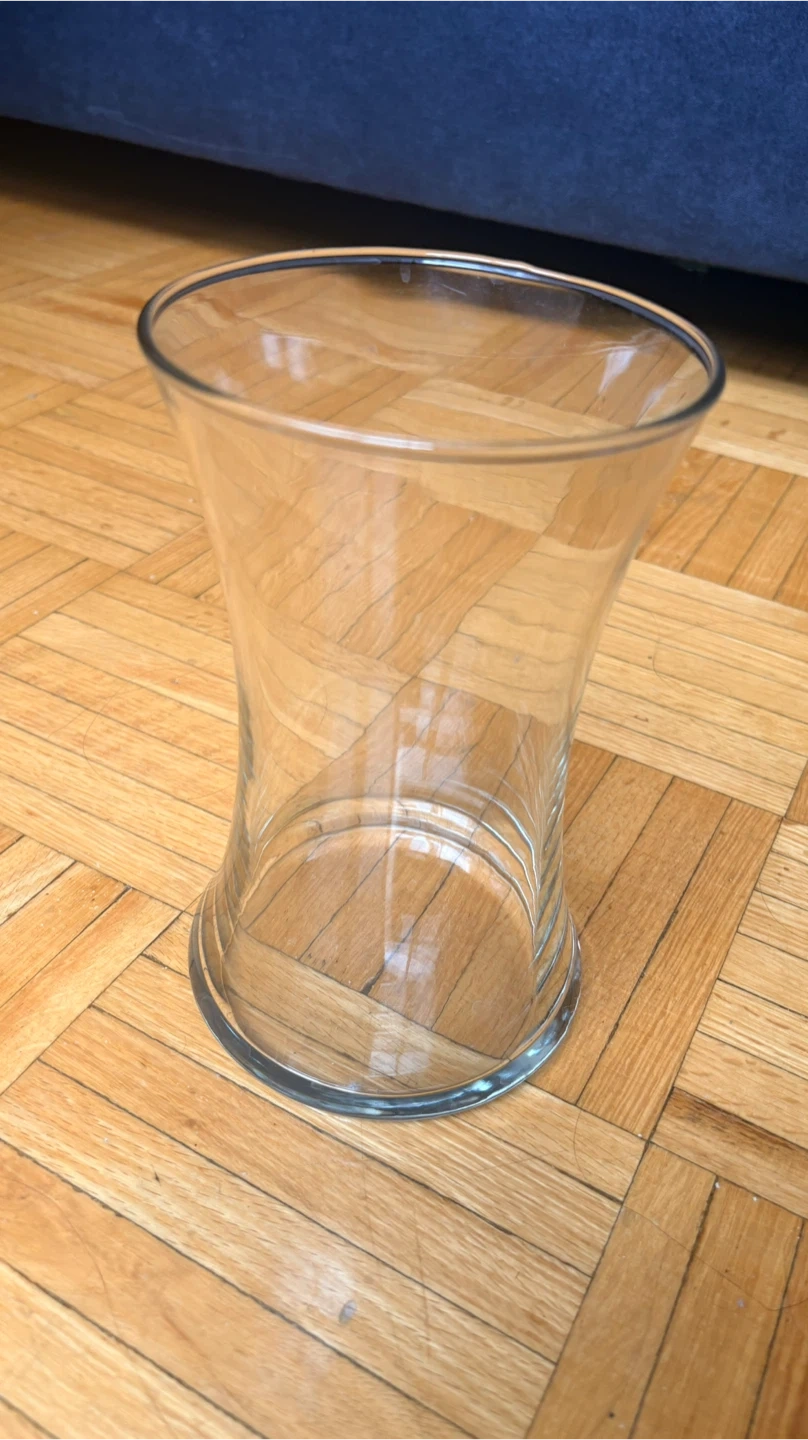 A clear glass vase with a curved shape. It's made of glass and has a smooth finish. This vase is suitable for displaying flowers.