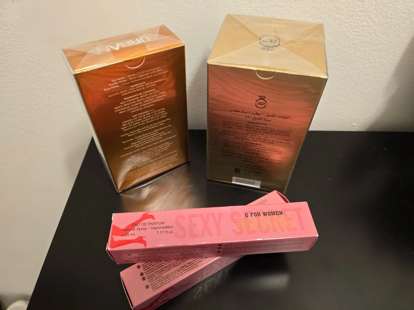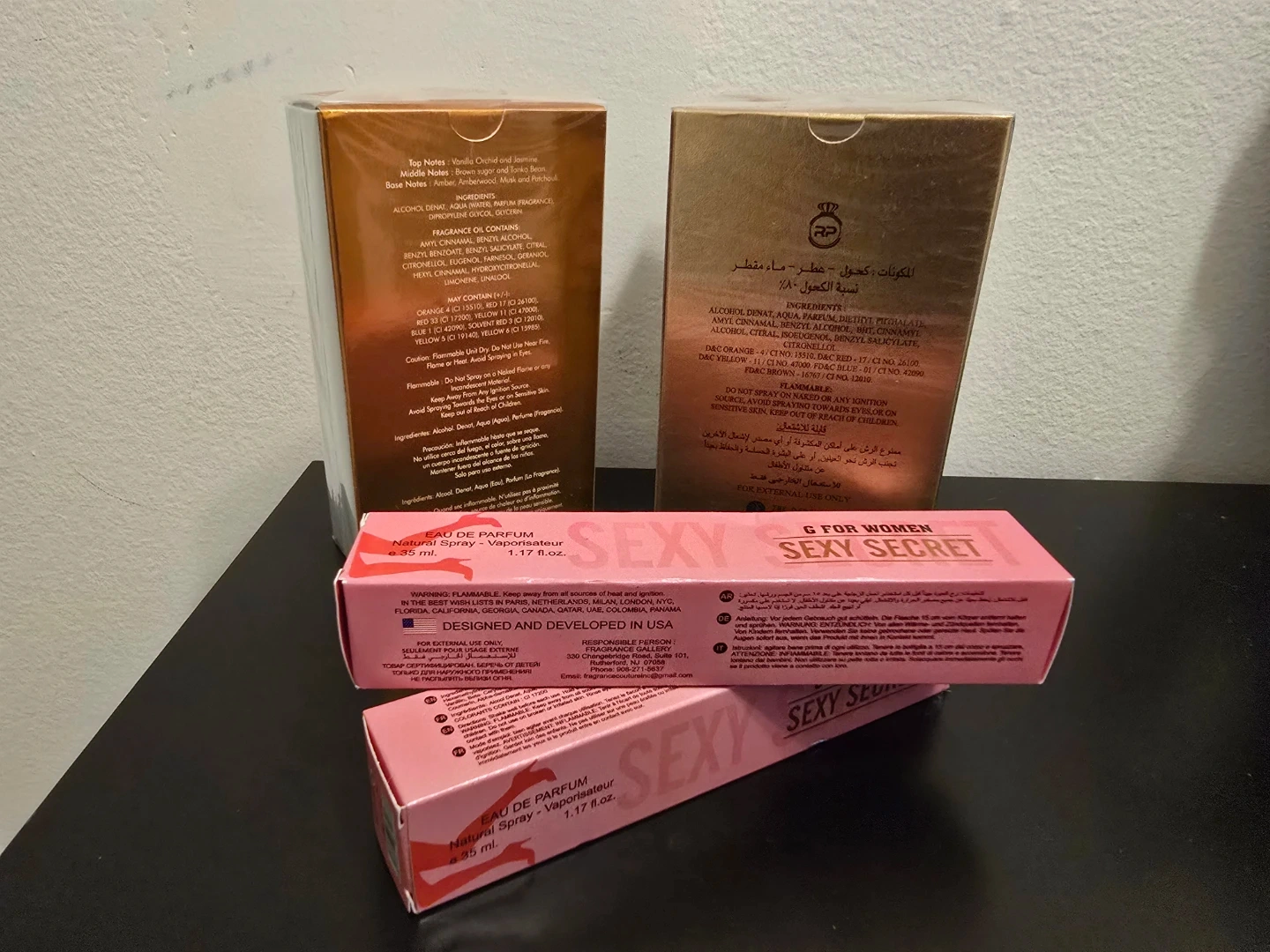 1. Sexy Secret G for Women (2pc) Eau de Parfum natural spray. Each bottle contains 35 ml (1.17 fl. oz.) of fragrance. Ingredients are listed on the packaging.
