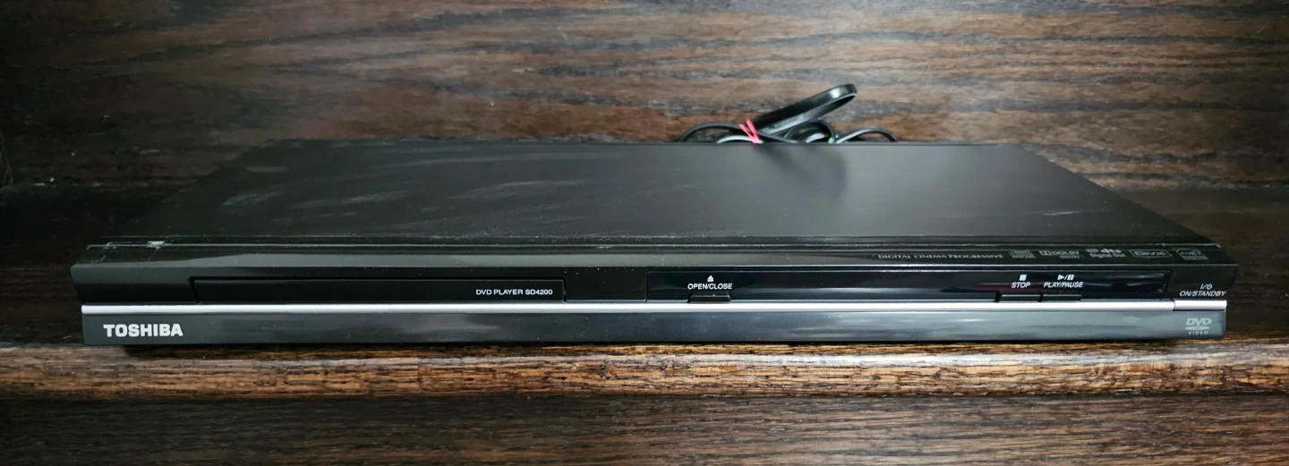 This is a Toshiba SD4200 DVD Player. It supports Dolby Digital and DTS output. This unit is black and it's 120V.