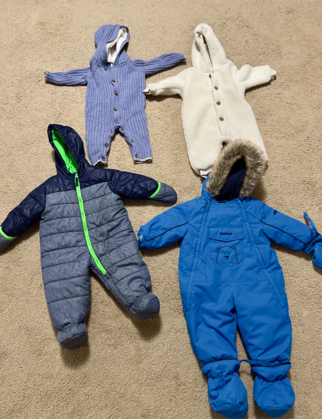 Four cozy baby snowsuits for winter warmth. Includes a blue OshKosh snowsuit with a bear design and fur-lined hood. Also features a grey puffer suit with a bright green zipper, a purple knit romper, and a white fuzzy fleece suit.