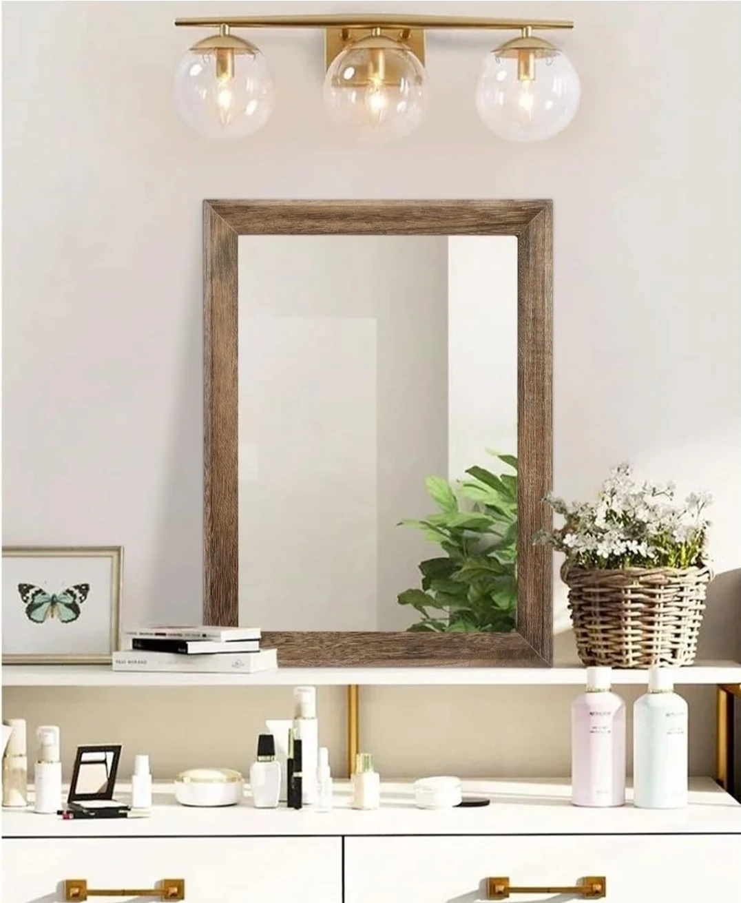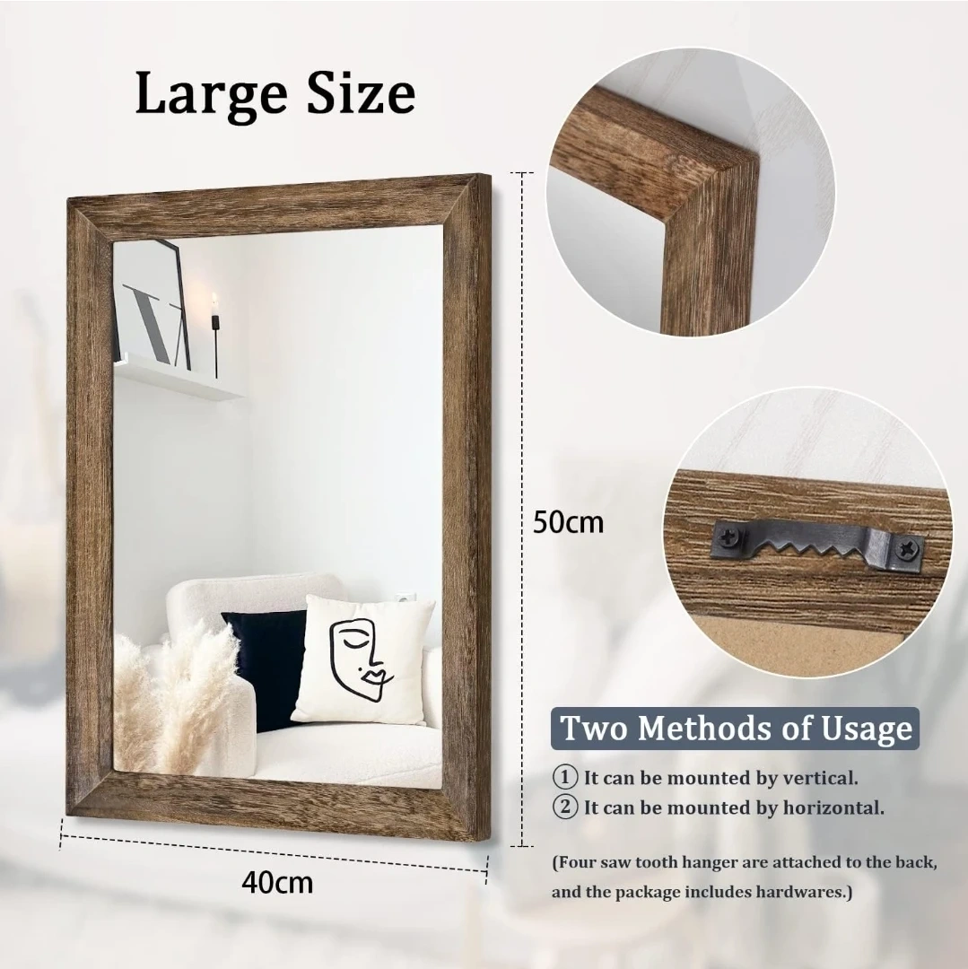 This AAZZKANG mirror features a rustic wood frame in a brown finish. It measures 50cm by 40cm, offering a large size for your space. It can be mounted vertically or horizontally and includes four saw tooth hangers.