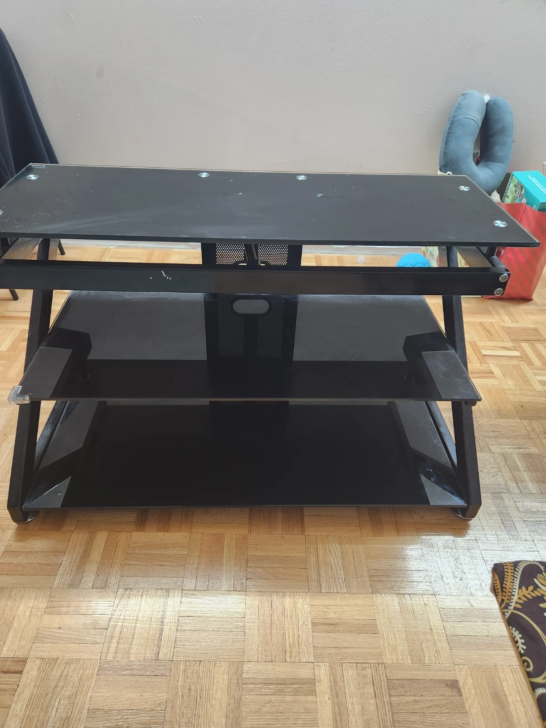 This is a black 3-tier entertainment stand with a glass top and shelves. It has a metal frame. The stand offers ample space for media components.