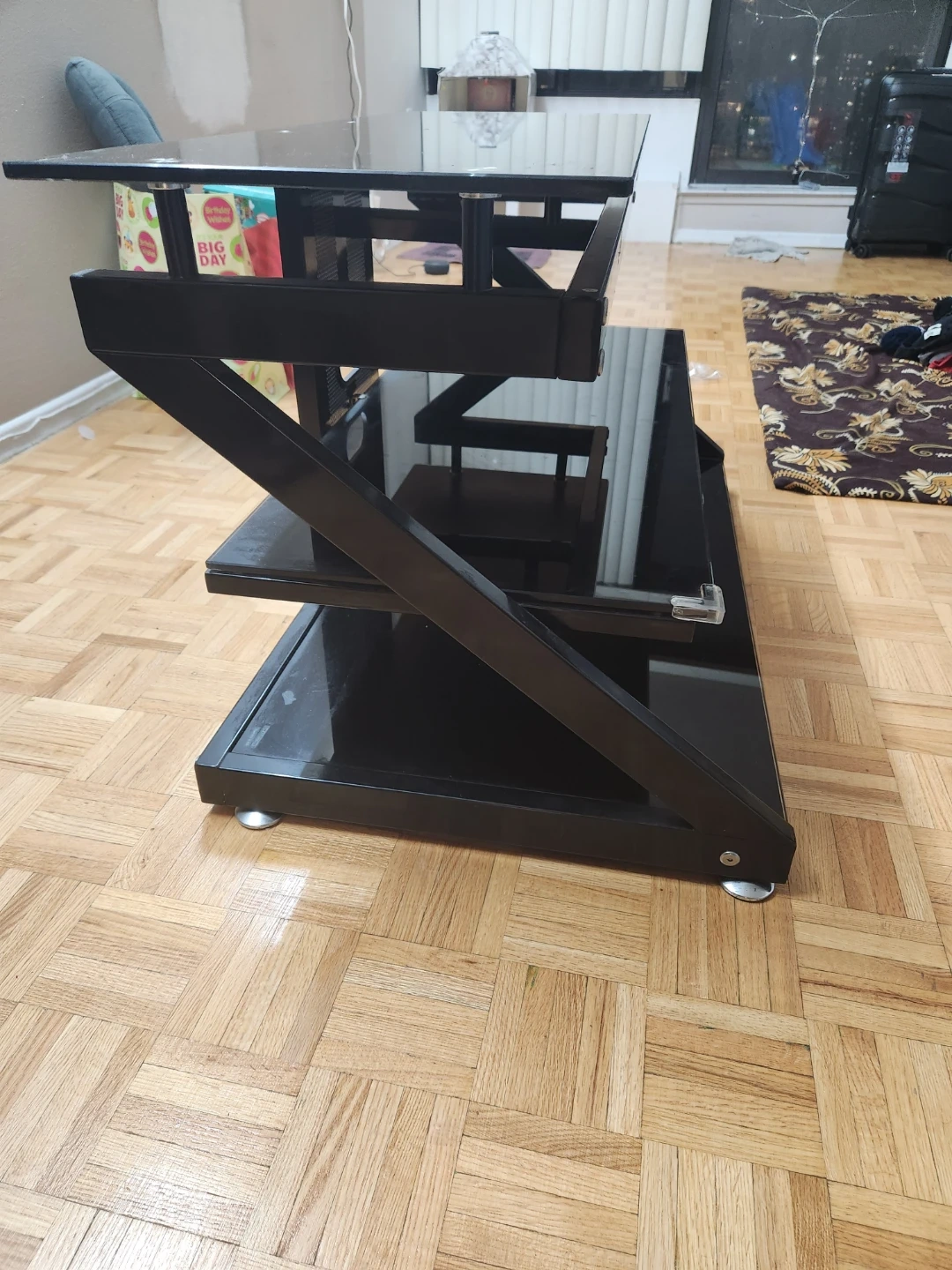 This is a black 3-tier entertainment stand with a glass top and shelves. It has a metal frame. The stand offers ample space for media components.