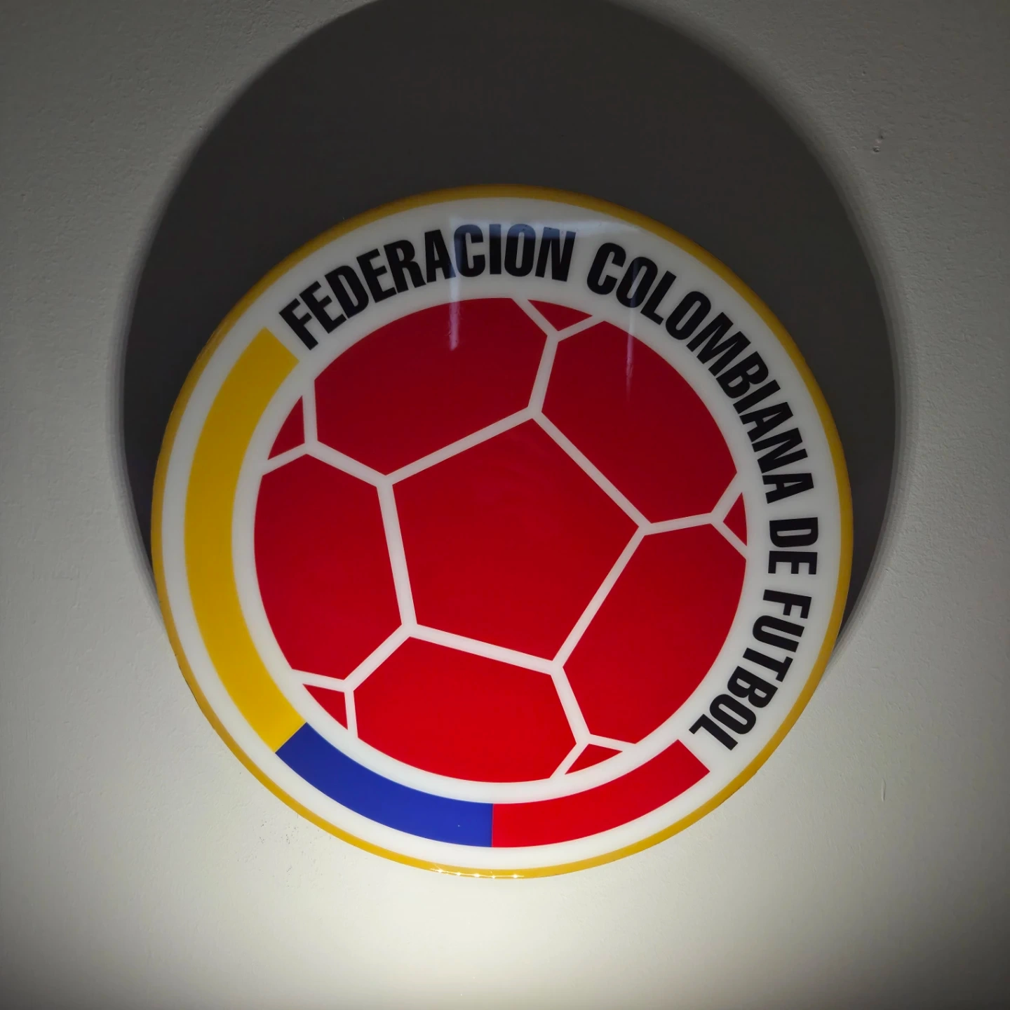 This is a wall sign for the Federacion Colombiana de Futbol. It features the organization's logo with a soccer ball design. Great for any fan of Colombian football!
