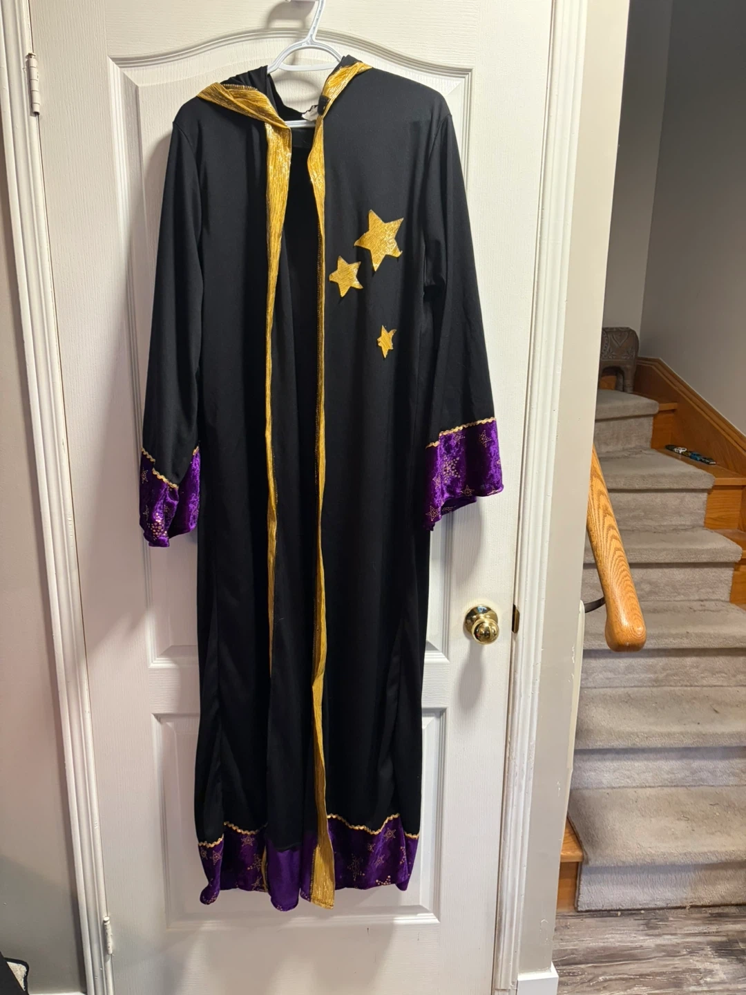 This black robe has a gold trim and purple accents on the sleeves and hem. It's decorated with gold stars. It's perfect for a wizard's costume!
