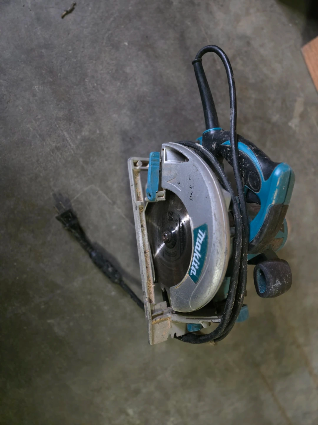 Used Makita circular saw with a powerful motor for cutting wood. This corded saw is ready for your next project. It features a durable metal guard and a comfortable grip handle.