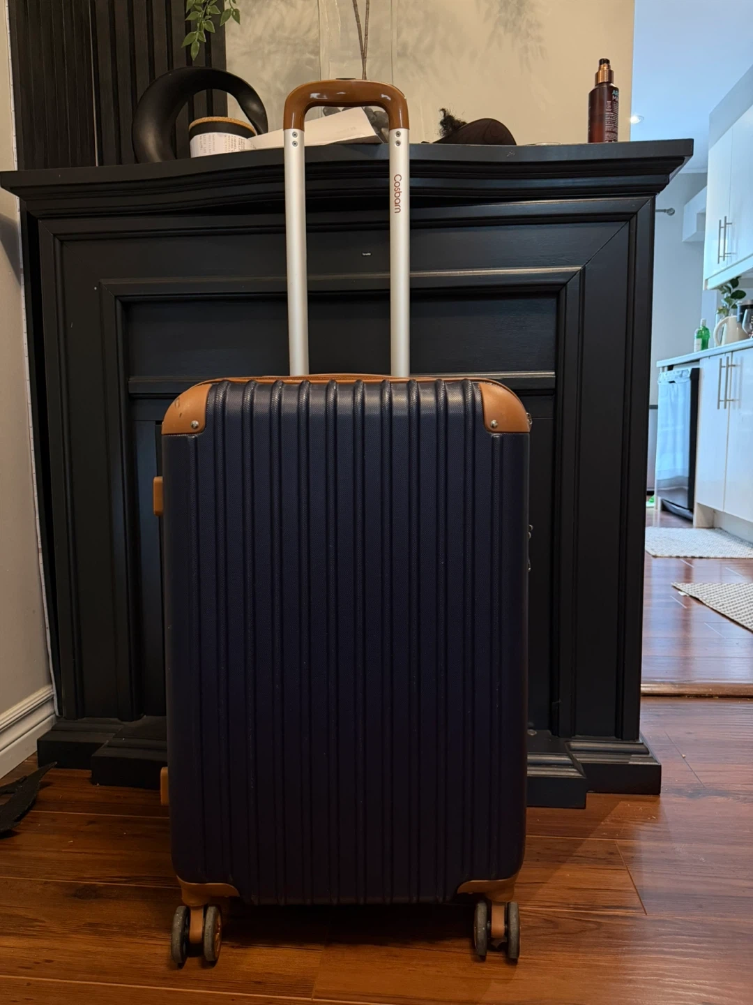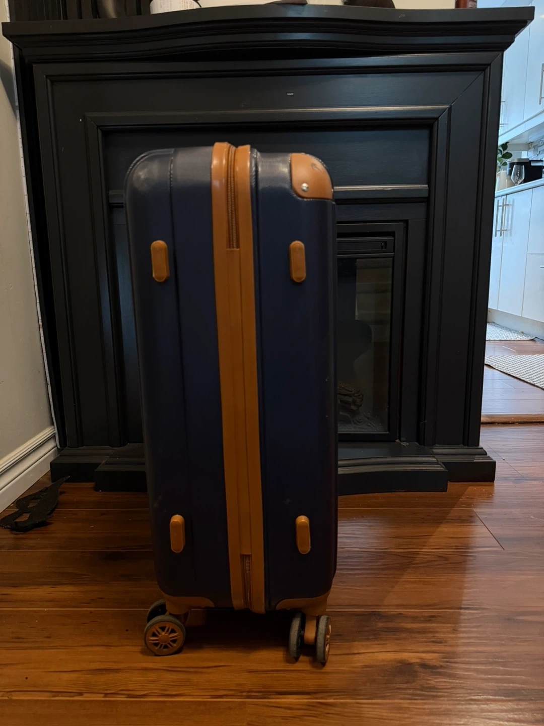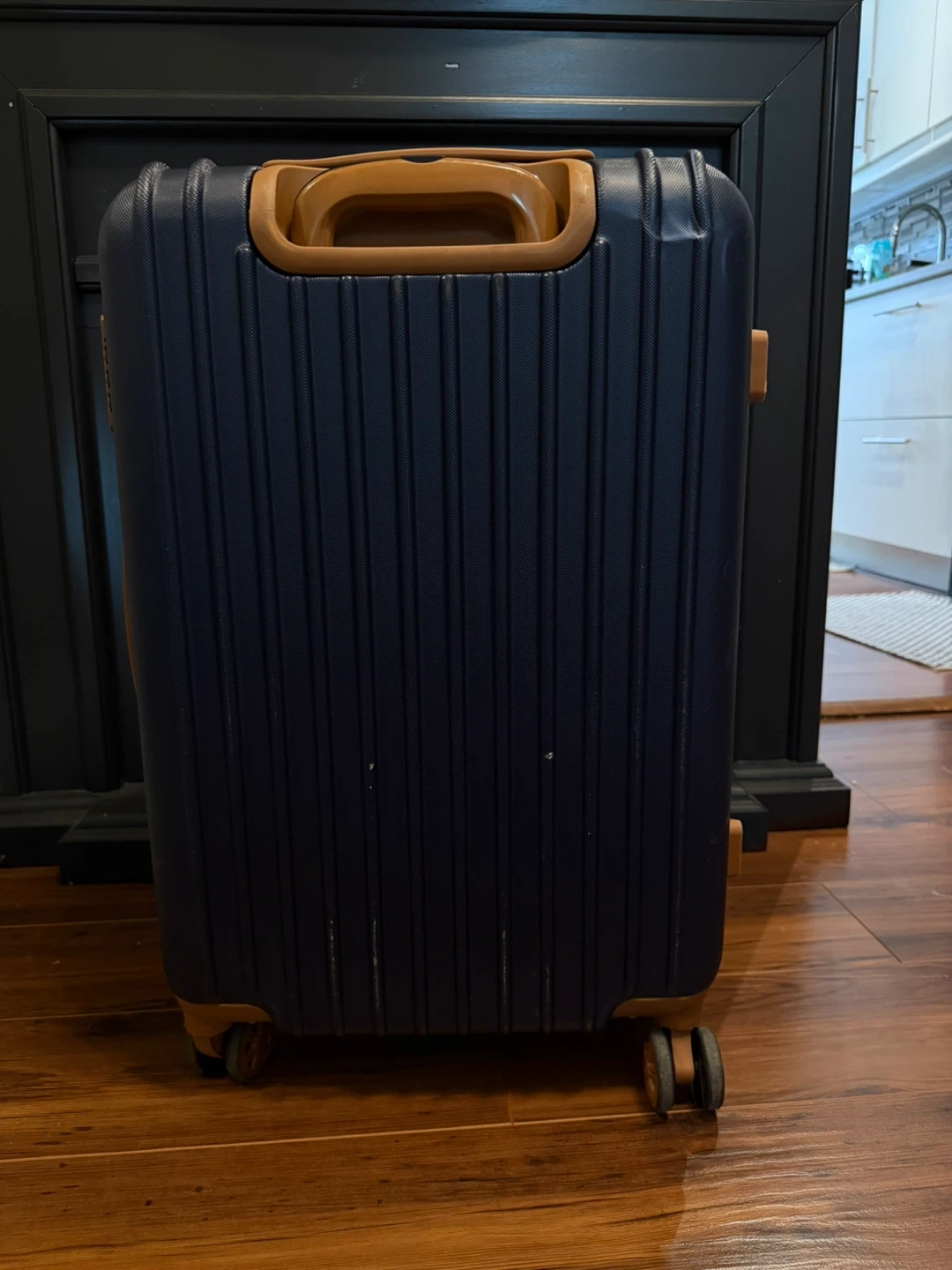 Selling a navy blue hardside carry-on luggage. It's in good condition and ready for your next trip! Features a retractable handle and spinner wheels for easy maneuvering.