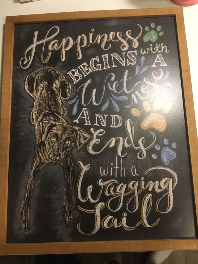 This charming chalkboard art piece features a beautifully hand-drawn image of a dog, accompanied by the heartwarming phrase, "Happiness begins with a wet nose and ends with a wagging tail." This delightful decor item would make a perfect addition to any dog lover's home. Pricing is fair for its unique charm. If you're reading this, yes, it's still available! Cash accepted.