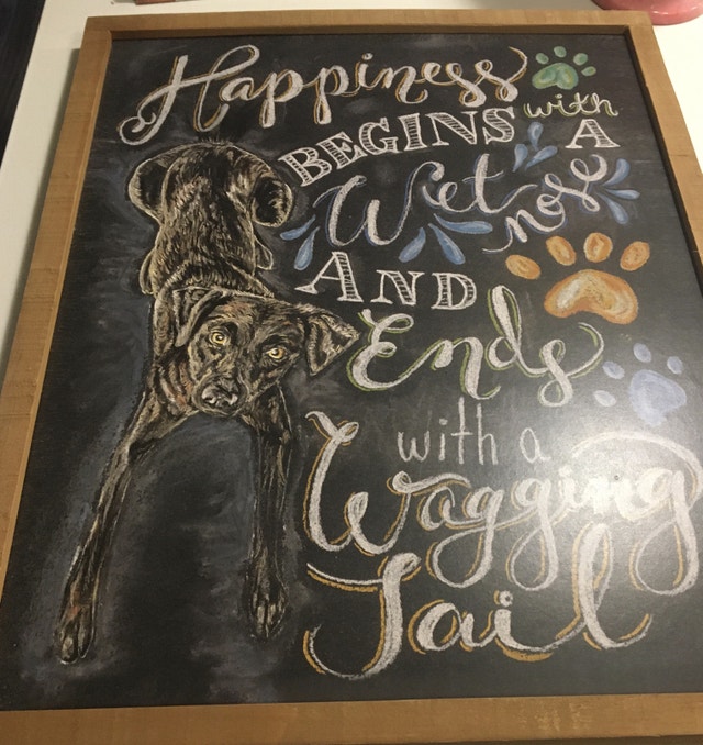 This charming chalkboard art piece features a beautifully hand-drawn image of a dog, accompanied by the heartwarming phrase, "Happiness begins with a wet nose and ends with a wagging tail." This delightful decor item would make a perfect addition to any dog lover's home. Pricing is fair for its unique charm. If you're reading this, yes, it's still available! Cash accepted.
