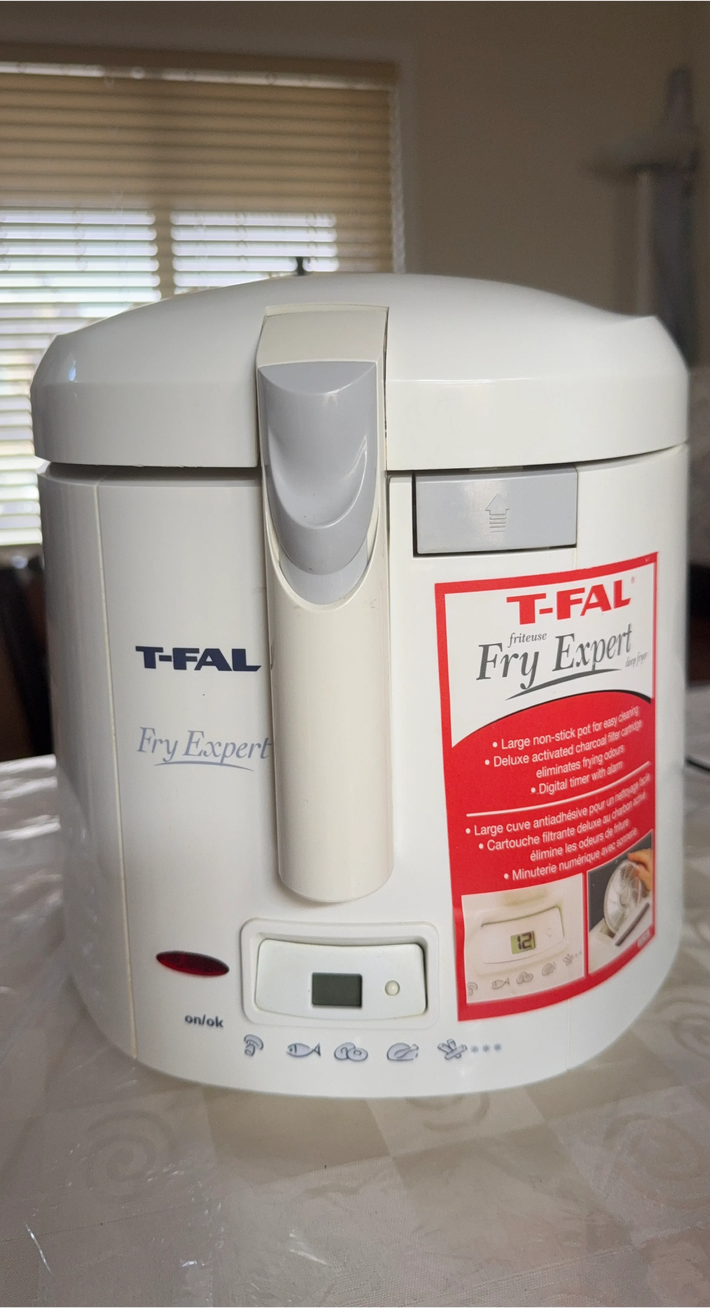 This T-FAL Fry Expert deep fryer is a great addition to any kitchen. It features a large non-stick pot for easy cooking and cleanup. Includes a deluxe activated charcoal filter to eliminate cooking odours. Also comes with a digital timer with alarm! It’s working great