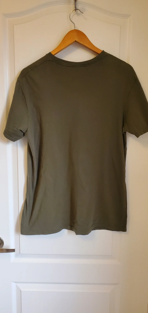 Green t-shirt with a graphic of Snoopy with a mountain landscape for his head. The graphic is in yellow, blue, grey and black. The t-shirt is a men's size Large.
