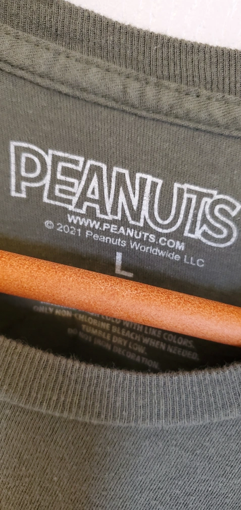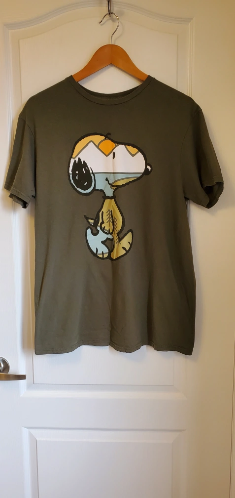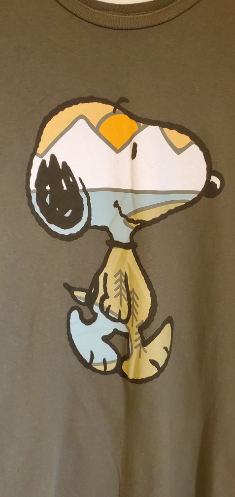 Green t-shirt with a graphic of Snoopy with a mountain landscape for his head. The graphic is in yellow, blue, grey and black. The t-shirt is a men's size Large.