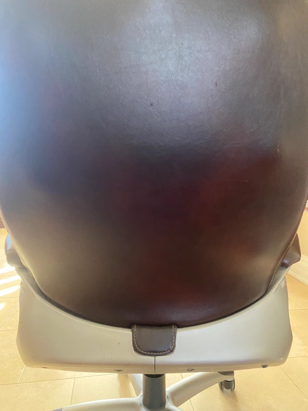 A comfortable brown faux leather office chair with a tilt and swivel function. It's designed for long hours of work. This chair would be useful for anyone needing an office setup at home.