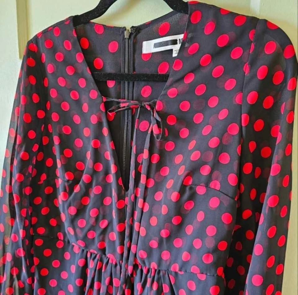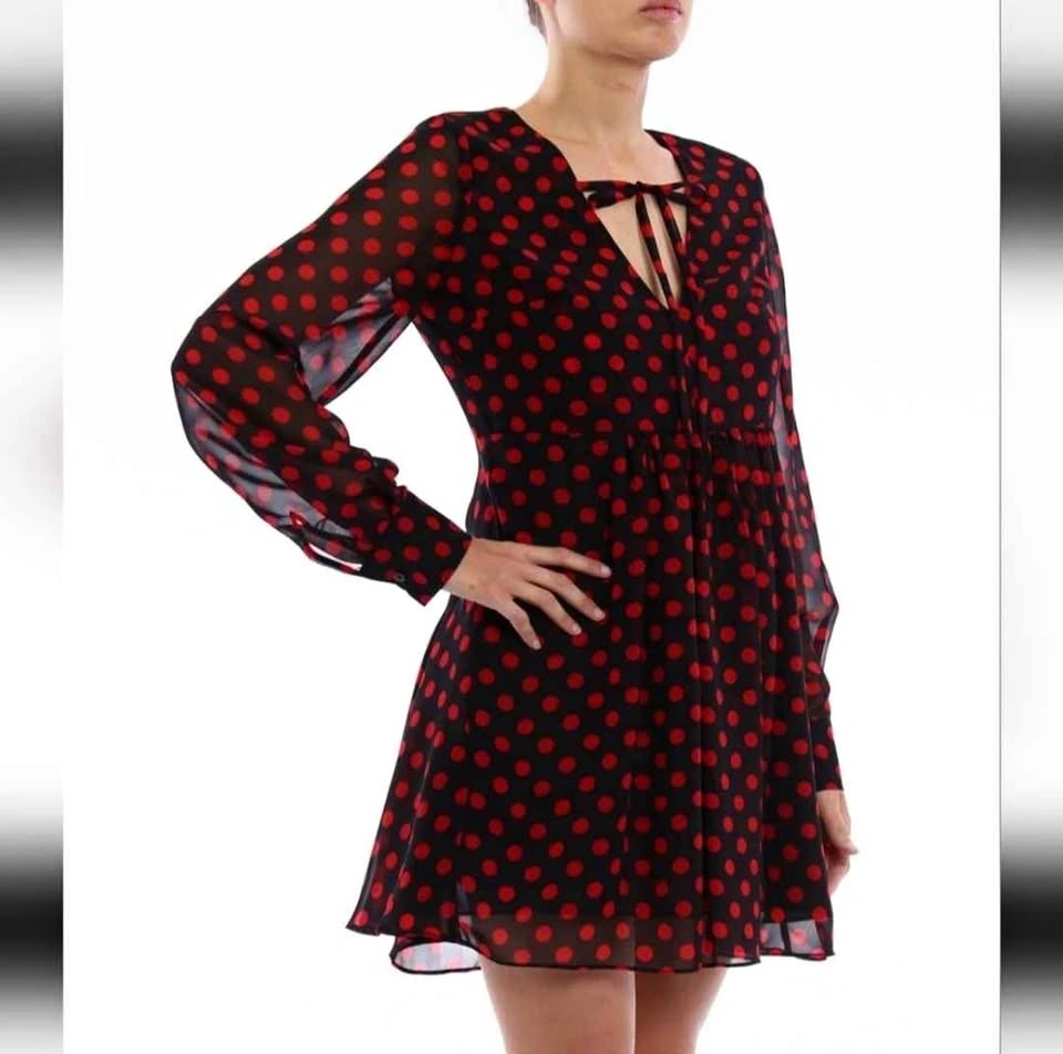 McQ by Alexander McQueen chiffon mini dress in black and red polka dot print. Dress features a V-neck with ties that form a bow at the collar, an A-line cut that flares from the waist, and a hidden rear zipper. The body is fully lined, while the sleeves are unlined and have button cuffs.